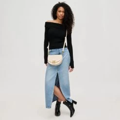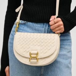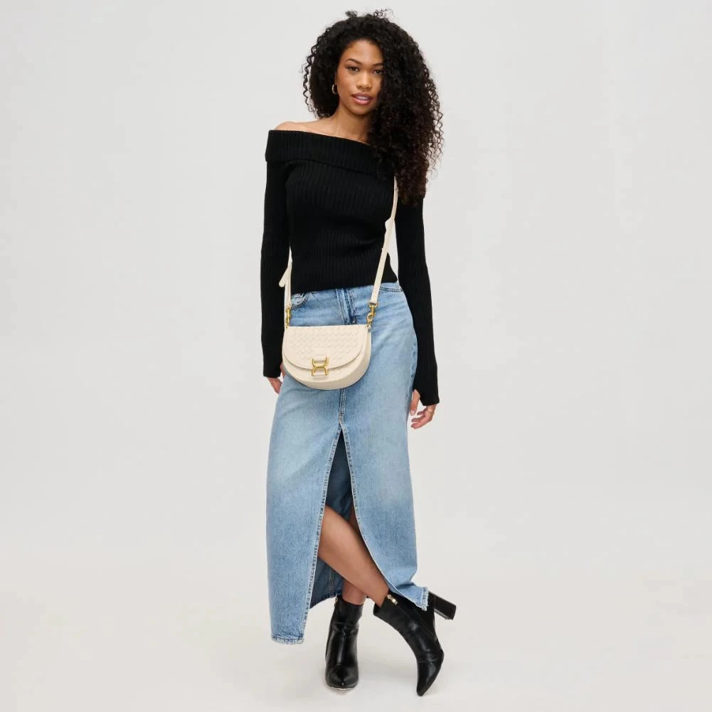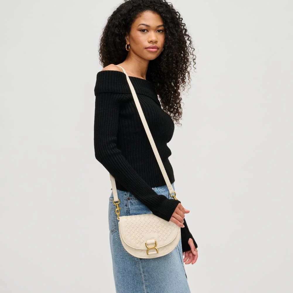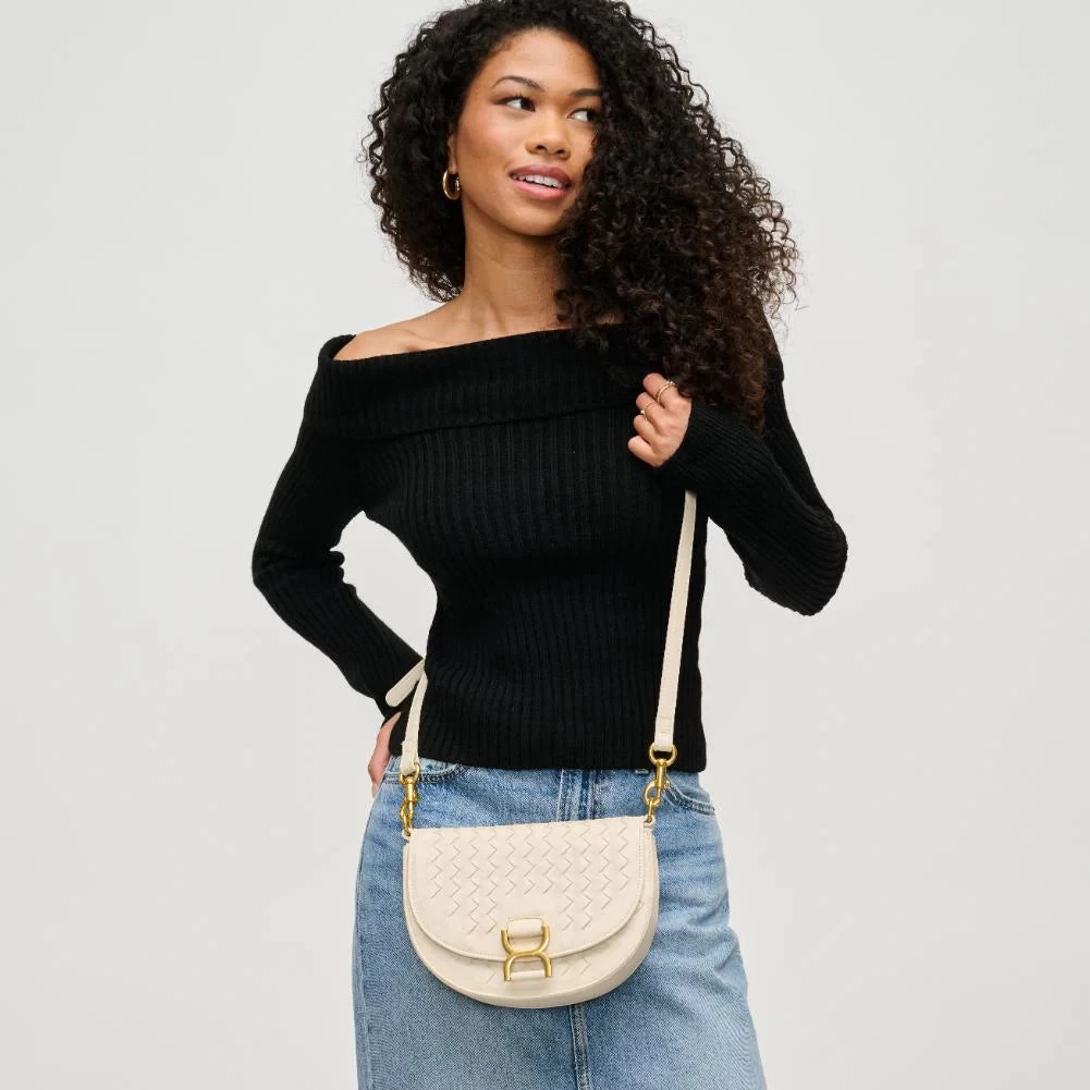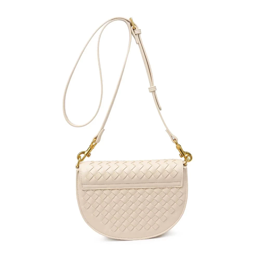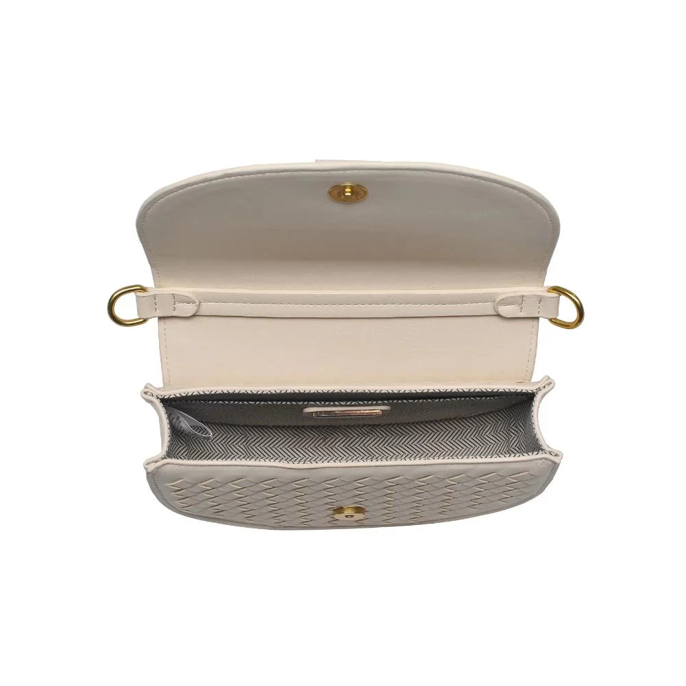 Upgrade your style with the Alise Crossbody in Oatmilk. Featuring a chic woven design and buckle detail, this bag is accented with elegant gold hardware. The adjustable strap offers comfort and versatility, while the printed fabric lining and zip pocket provide practical organization. Made from vegan leather, this crossbody blends fashion and function effortlessly.