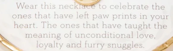 “Wear this necklace to celebrate the ones that have left paw prints in your heart. The ones that have taught the meaning of unconditional love, loyalty and furry snuggles.”