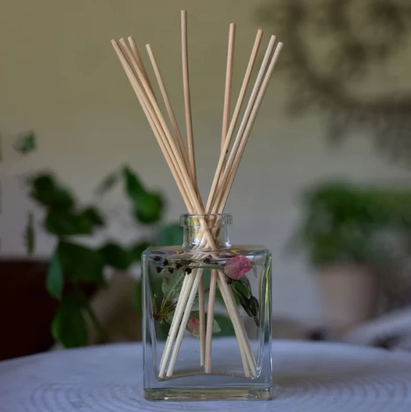 The Apricot Rose 4 oz Diffuser is a gorgeous and practical way to fill your space with invigorating fragrance. The dramatic square glass vessel is a sight to behold – showcasing real spices, fruit, and botanicals that have been delicately placed by hand to create a stunning display.