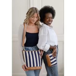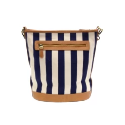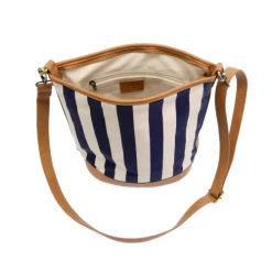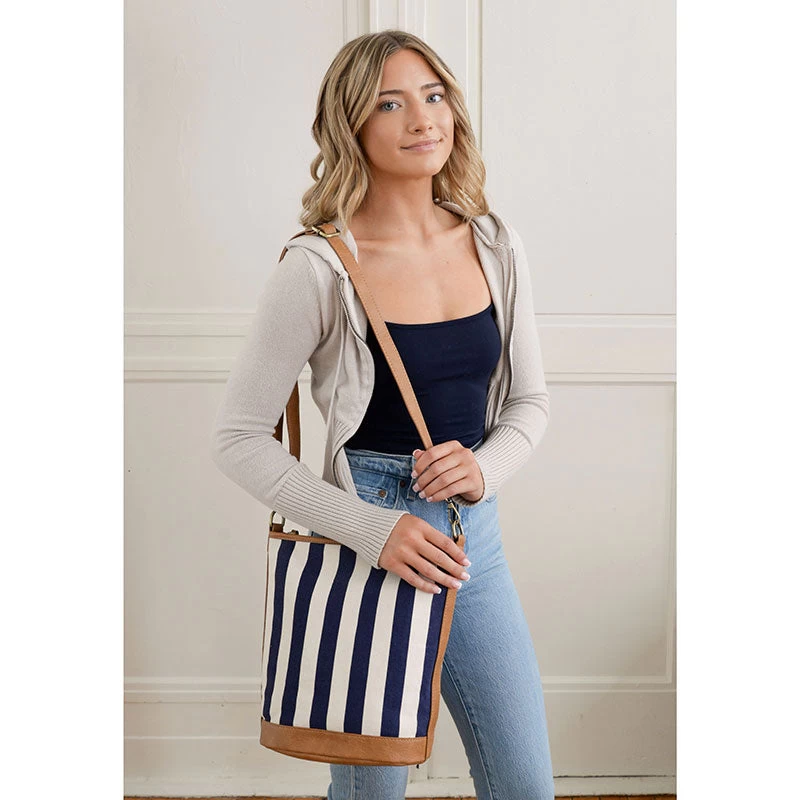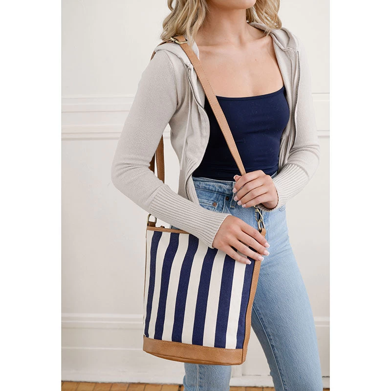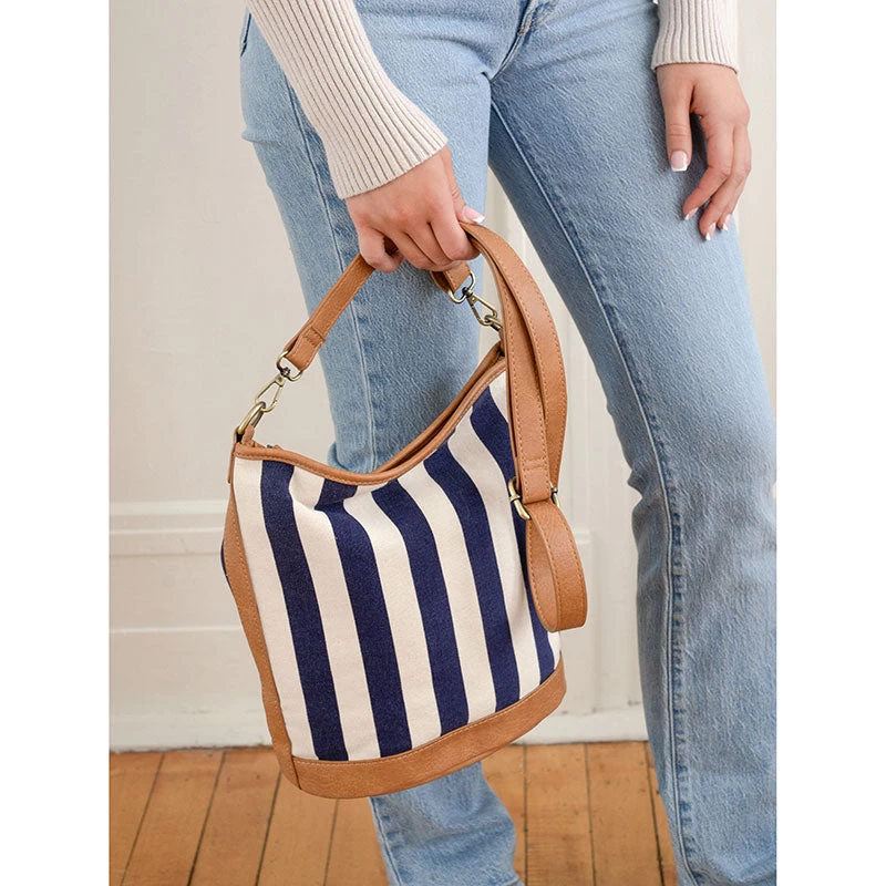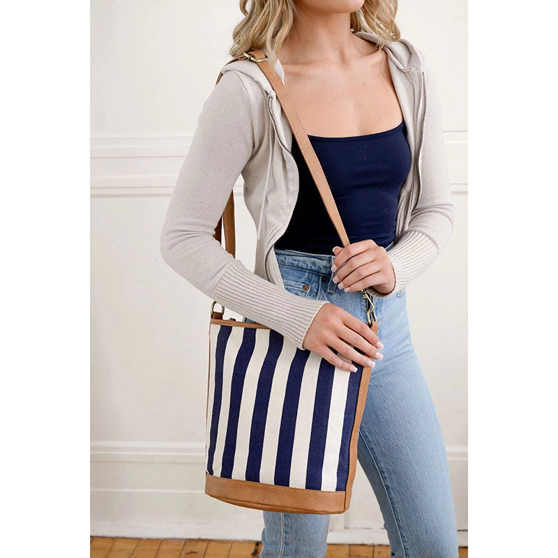 The Awning Stripe Bucket Canvas Bag in Navy is the perfect blend of style and practicality for your summer adventures. Made from durable and sustainable washed canvas, this bag features bold awning stripes and is trimmed with tan vegan leather for an elevated touch. The roomy yet compact bucket design includes a top zip closure with our signature Joy logo zip pull, a convenient front zipper pocket for your phone, and the option to carry it as a shoulder bag or crossbody with the removable shoulder strap. A versatile and chic accessory, the Sicily bag is the ideal companion for your next getaway or everyday outing.