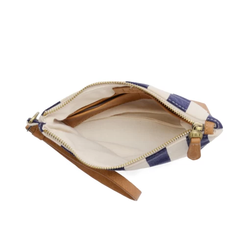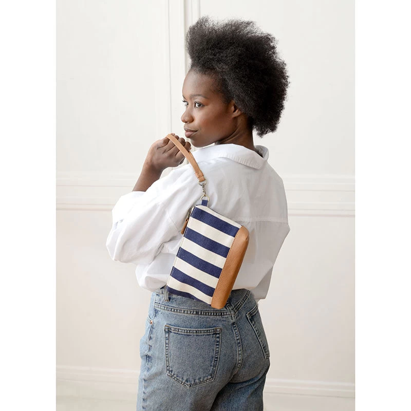 The Awning Stripe Wristlet Canvas Bag in Navy is the perfect grab-and-go accessory with a playful, yet practical design. Made from durable canvas, this wristlet features bold awning stripes and offers ample space to hold your phone, keys, and more. The interior credit card pockets keep you organized on the move. Whether you wear it as a wristlet or stow it in your bag, this cute and versatile piece is your go-to for staying organized and stylish. Ideal for quick errands or nights out, this bag does it all!