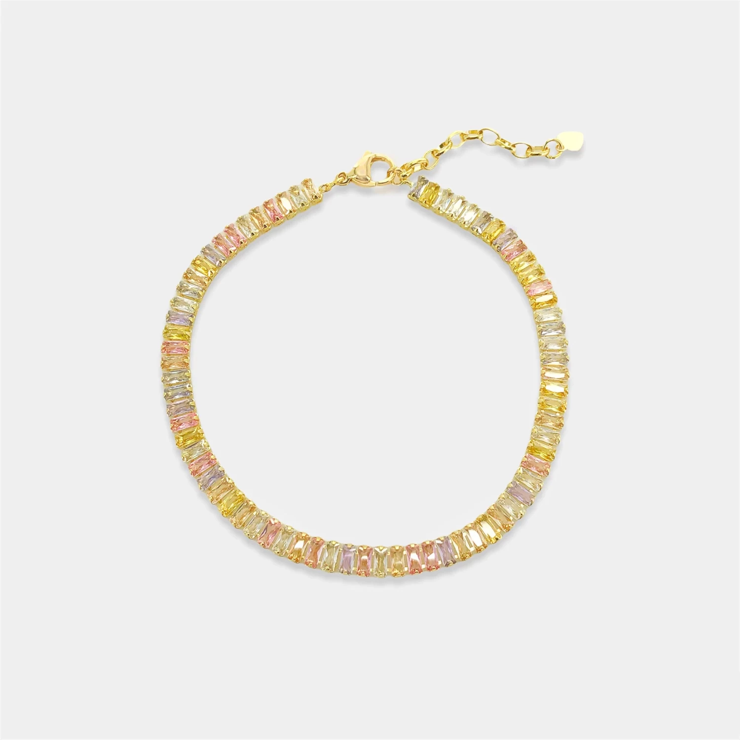 Elevate your summer sparkle with the Baguette Cut CZ Anklet in Gold—a sleek and stylish ankle bracelet featuring shimmering baguette-cut cubic zirconia. Set on a delicate gold-plated chain, this eye-catching anklet is available in clear, emerald, or multicolor CZ options, letting you personalize your shine. Perfect for pairing with sandals or heels, this dainty gold anklet adds a luxe, modern edge to your summer accessories lineup. Also available in rhodium plating for a cool-toned finish.
