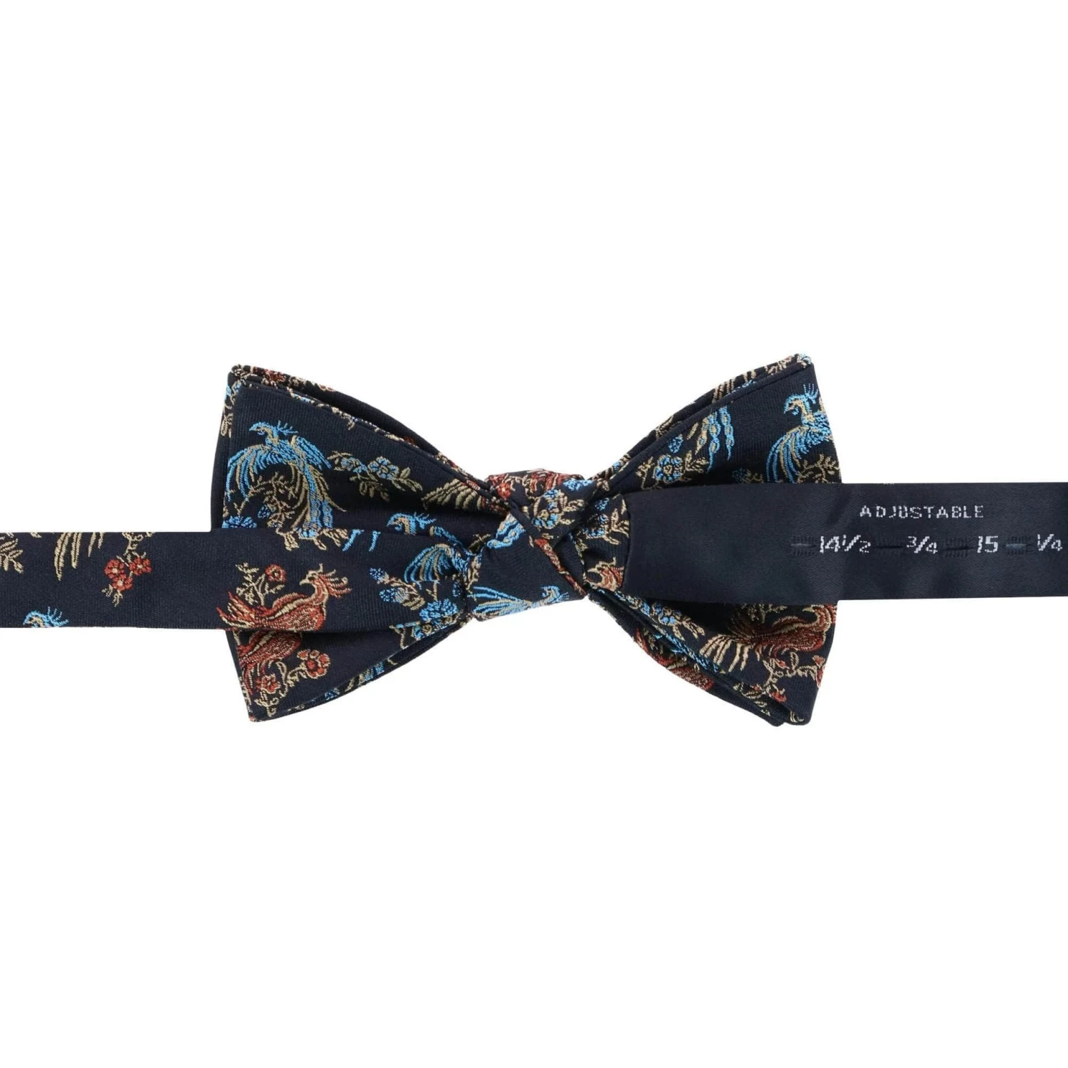 The Birds of Prosperity silk bow tie is a stylish companion piece to our Birds of Prosperity silk braces. However, it can also stand alone and be mixed with your favorite suit or tux. The richness of colors and details makes this bow tie a standout. Made of classic silk, this bow tie is adjustable from 14 1/2 to 20 inches giving you the proper fit. Suitable for graduations, weddings, interviews, meetings, or even a first date. Create your own distinguished look by tying the Birds of Prosperity Bow Tie to any outfit.
