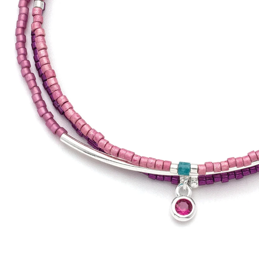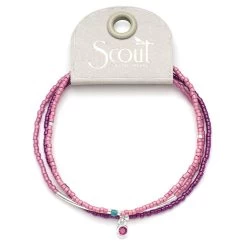 Elevate your wrist game with our Bracelet Trio- Fuchsia/Silver. These tonal bracelets feature a playful mix of textures and a delicate rhinestone charm, adding a touch of luxury to any outfit. Made with Miyuki Delica beads, plated brass beads, semi precious stones, and our signature Scout logo, these stacking bracelets come beautifully packaged on a luxe paper card with gold foil. Upgrade your accessory collection today.