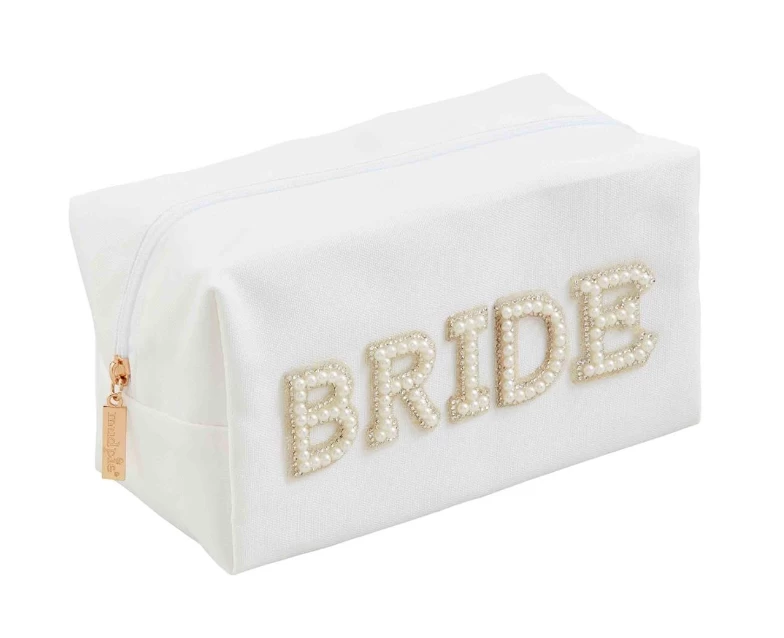 This stunning lined nylon zipper case features a luxurious pearl patch with the word “Bride” elegantly written across it. Keep your essentials organized in style, perfect for any bride on her special day. The perfect accessory for a luxurious and exclusive wedding.