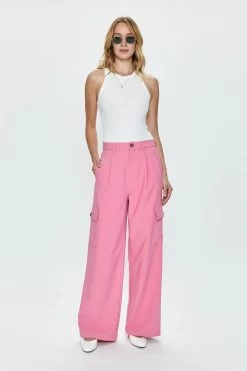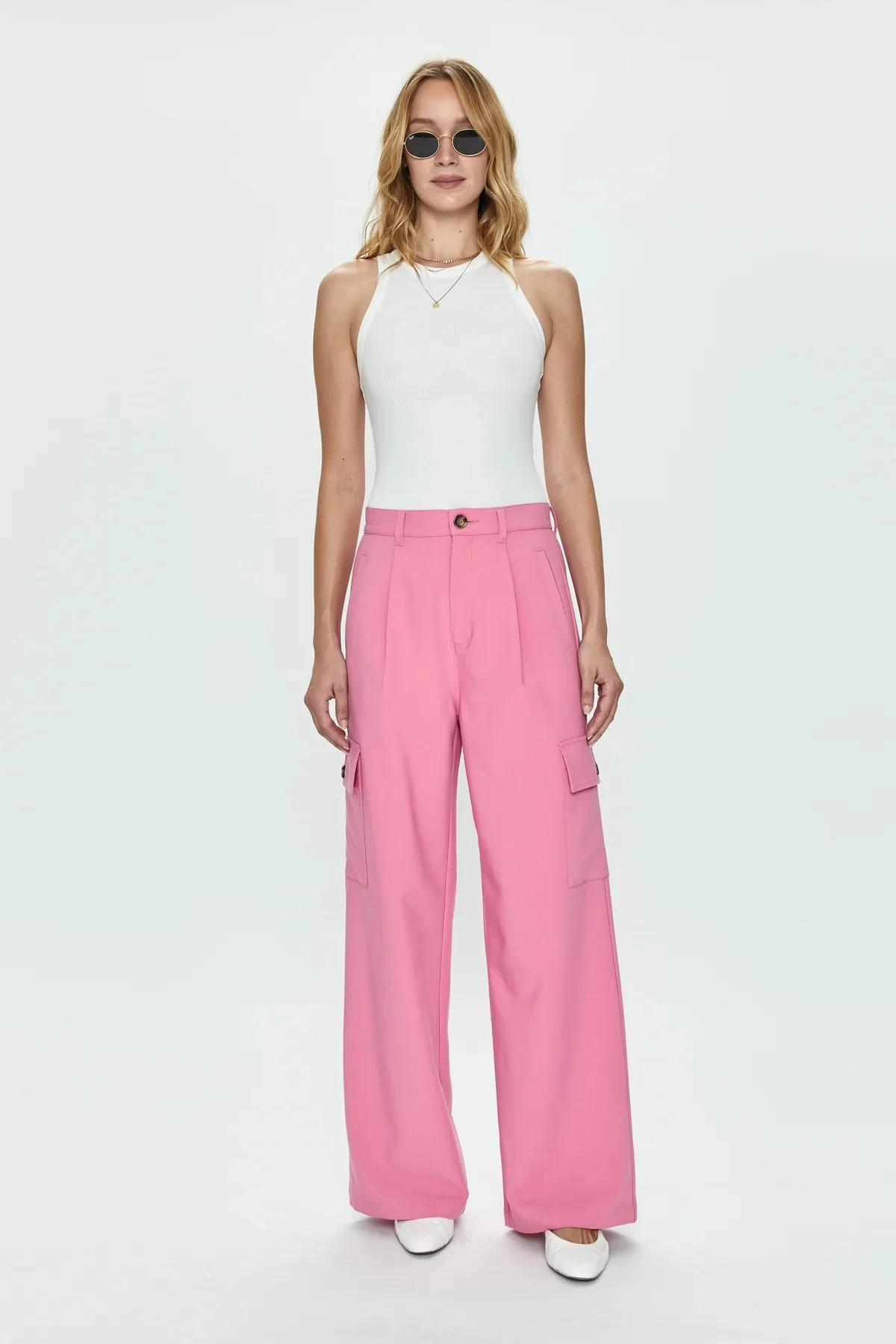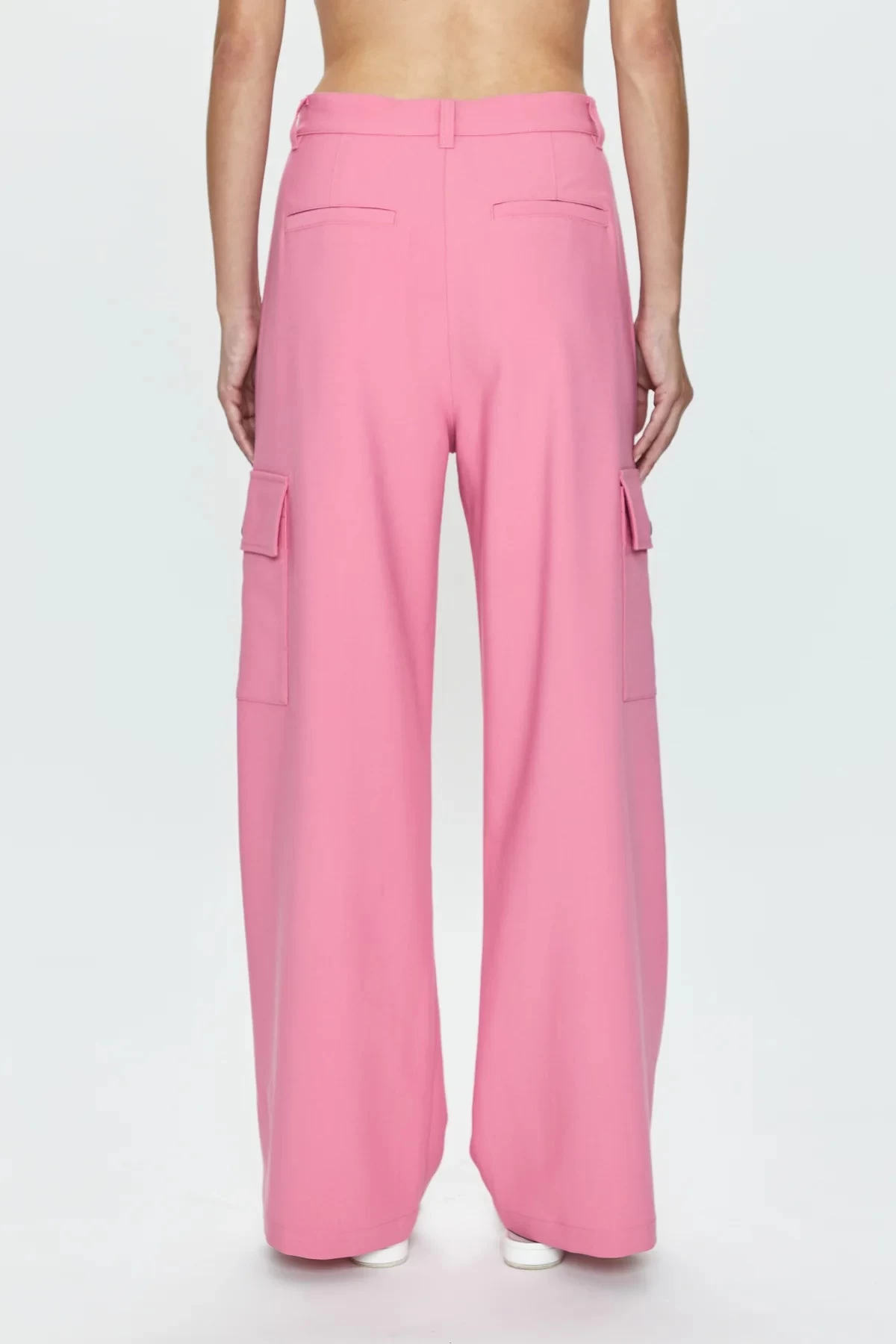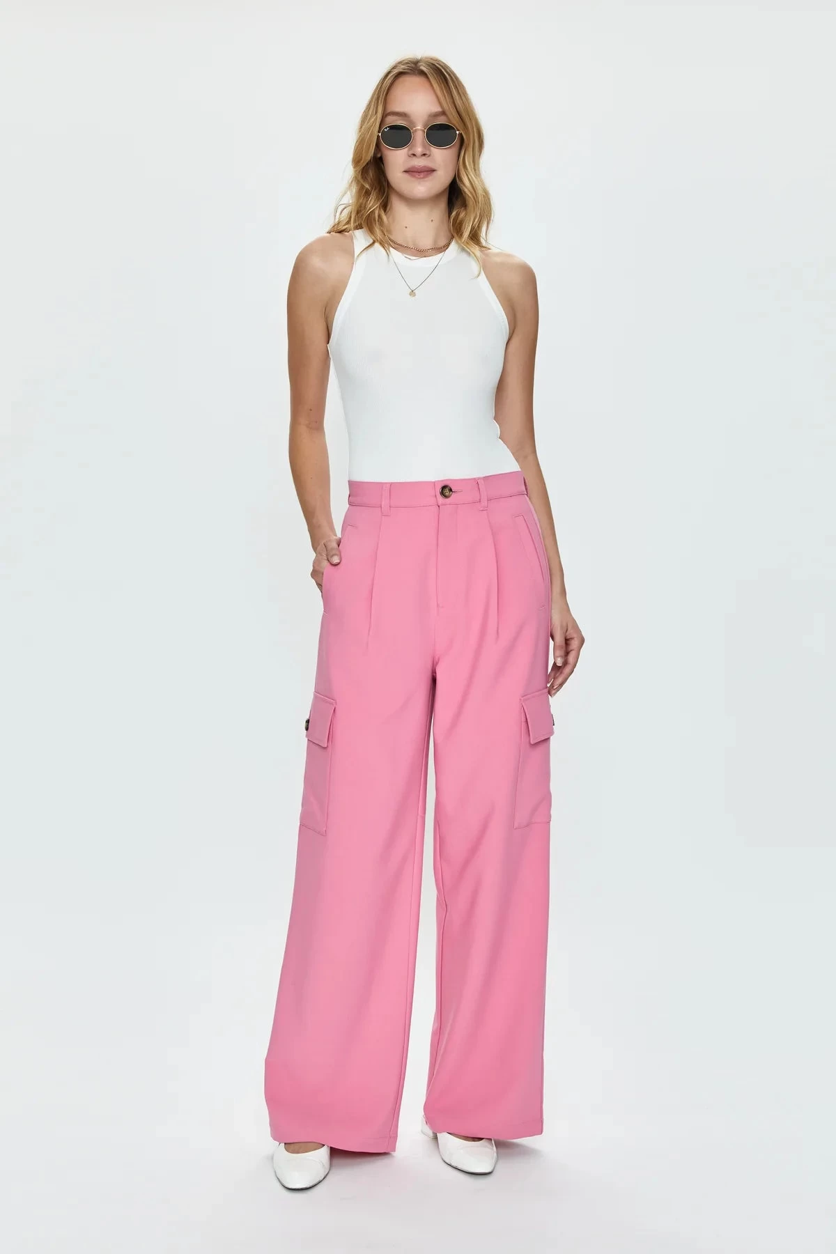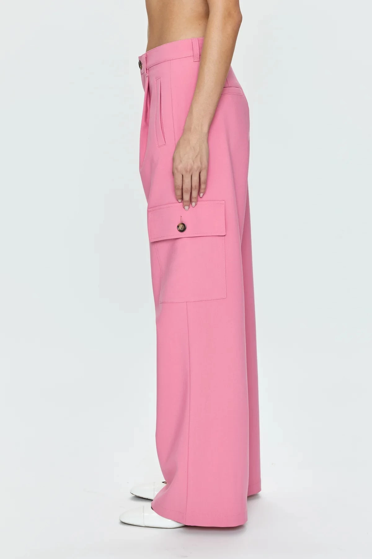 Elevate your style with the Brynn Pants. Featuring a high rise waist and relaxed wide leg, these pants exude effortless cool. Oversized summary-flap cargo pockets add a touch of utility, while the energizing power pink hue makes a bold statement. Perfect for the fashion-forward and confident.