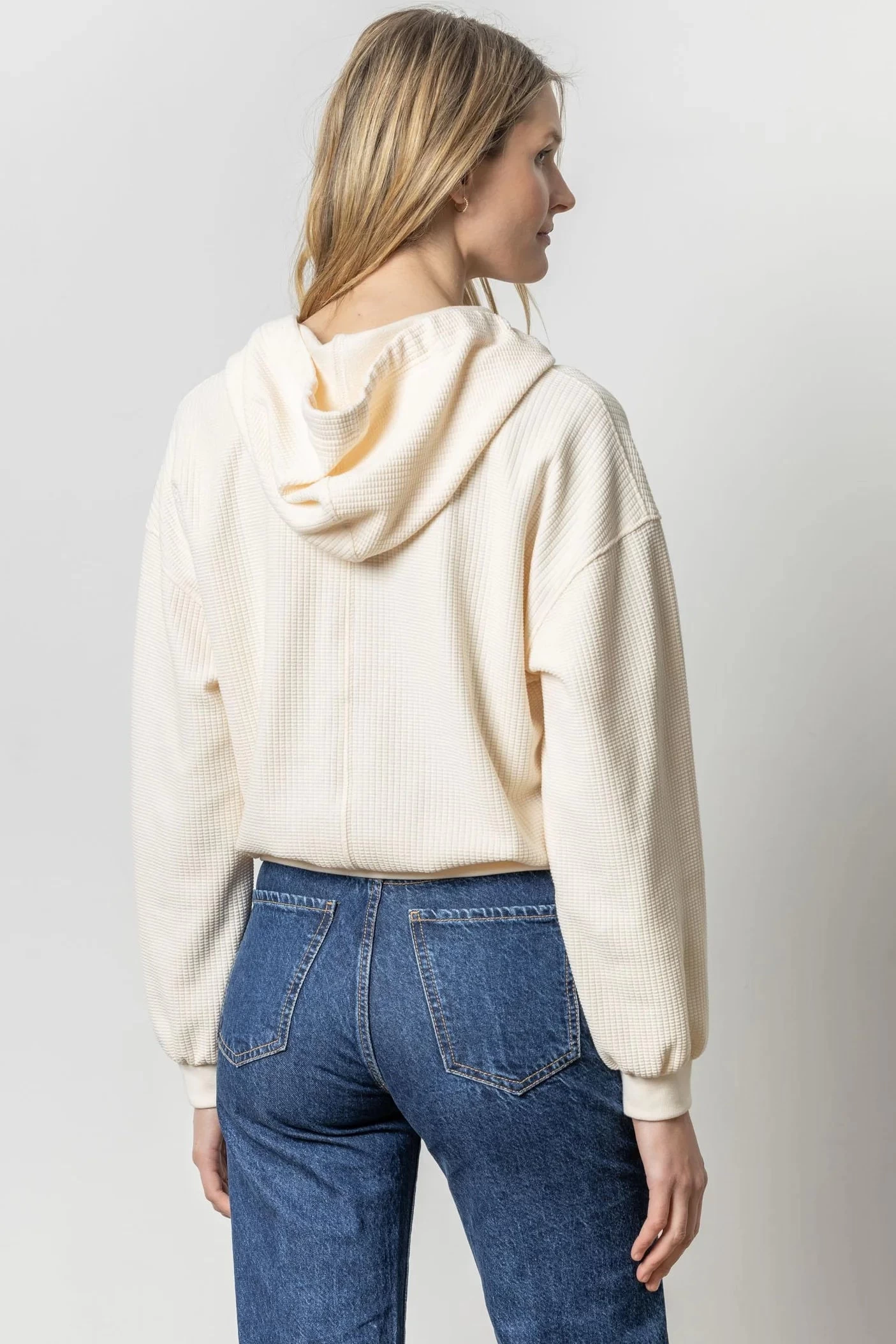 Indulge in ultimate comfort and style with our Button Front Hoodie in Talc. The luxurious waffle fabric offers a modern fit and features a convenient summary front and ribbed bottom for a flattering silhouette. Complete the look with the matching waffle pants or pair it effortlessly with any ensemble. Elevate your wardrobe with this sporty yet sophisticated essential.