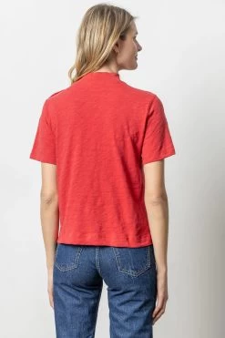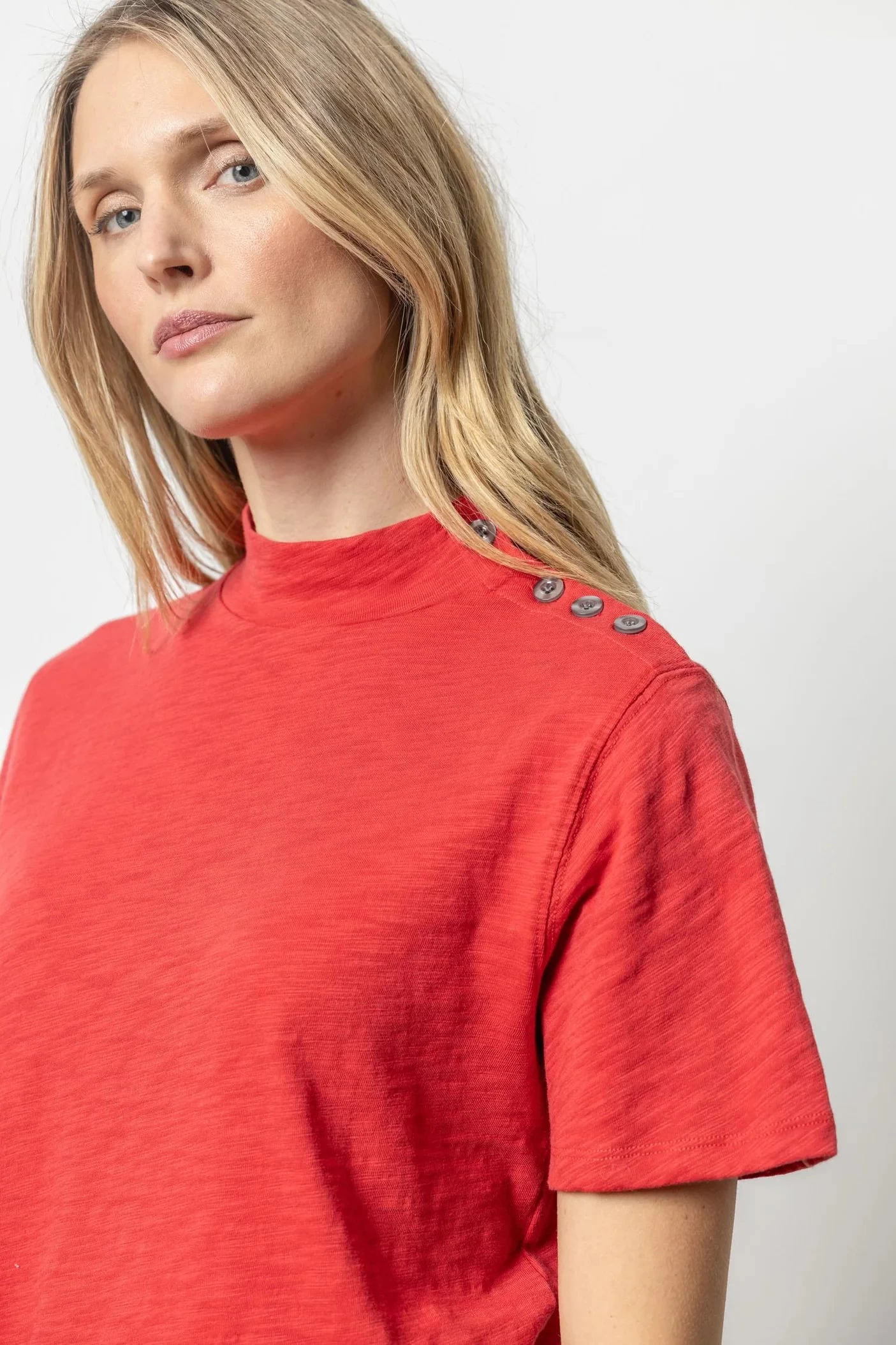 Elevate your wardrobe with our Button Shoulder Mock Neck top. Crafted with a mock neck and relaxed short sleeves, this tee features a unique summary detail along the shoulder. Its loose knit slub fabric allows for a flattering fit that can be effortlessly layered or worn on its own. Add a touch of sophistication to any look with this versatile and chic piece.