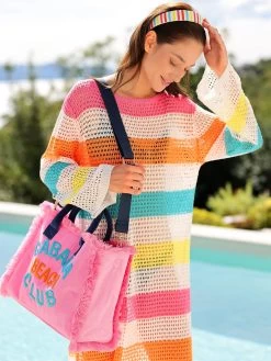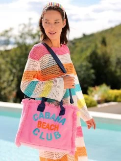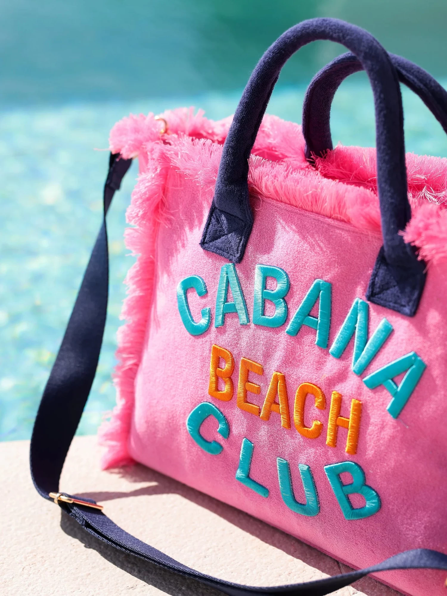 The “Cabana Beach Club” Tote in Pink is your ultimate summer companion, bringing vibrant fun and laid-back vibes. Crafted in a bold pink hue with playful fringe detailing, it’s adorned with colorful “CABANA BEACH CLUB” embroidery for a splash of personality. Spacious enough to hold all your beach day essentials – towels, sunnies, sunscreen, and snacks – with sturdy navy handles and an adjustable crossbody strap for practicality. Whether poolside or on a tropical getaway, this tote says you’re here for a good time! The retro-inspired charm and bright, cheerful colors scream summer vacation, making it the perfect statement bag for any sunny day!