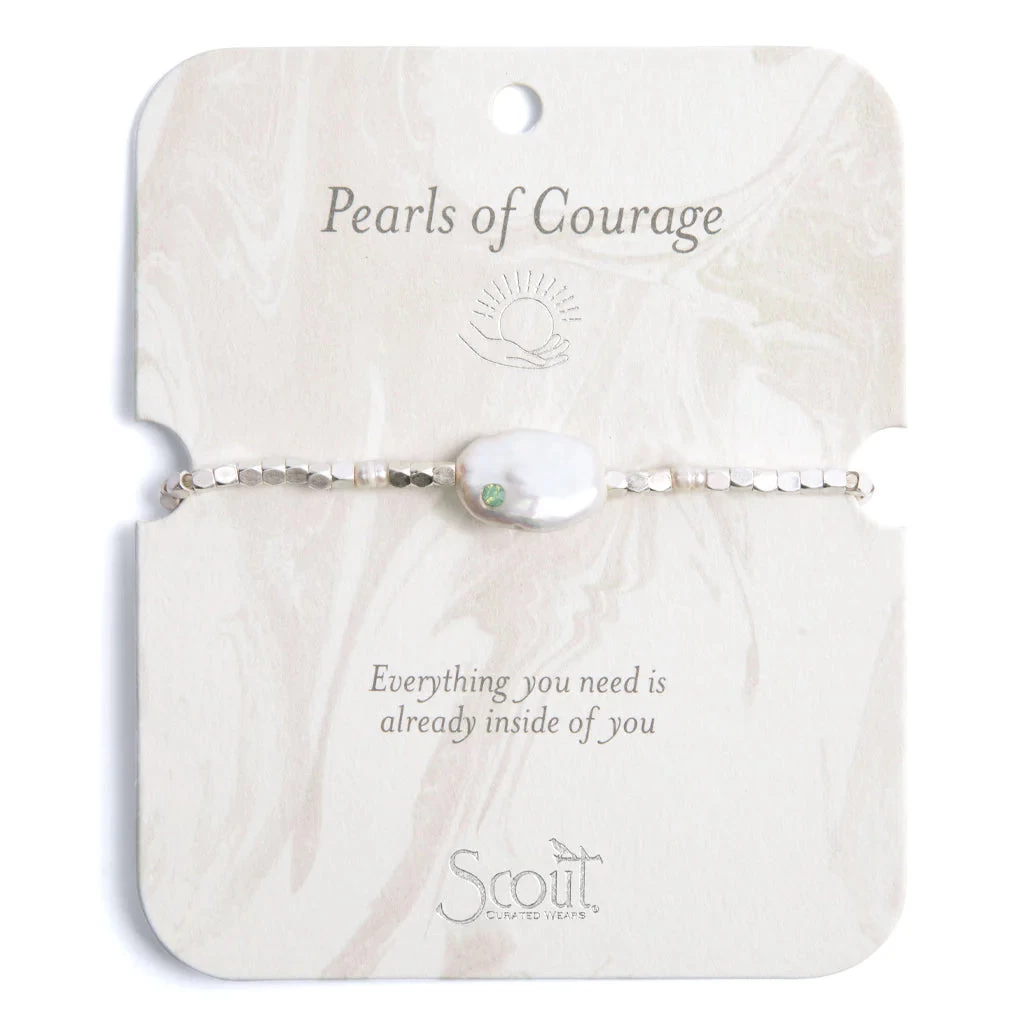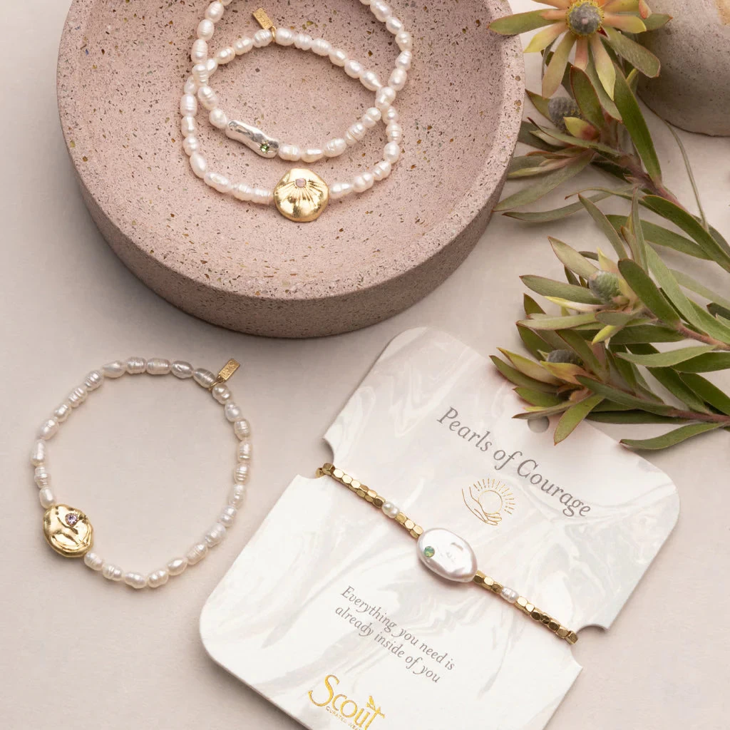 Embrace courage with our stunning Courage Affirmation Bracelet in Silver. Engravings and inset crystals symbolize the power of courage, while natural rice pearls and organically shaped medallions add a touch of elegance. Wear it as a daily reminder to channel courage in every aspect of your life.