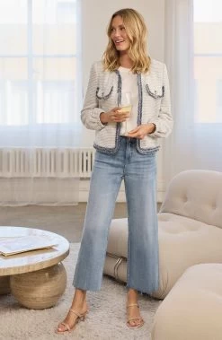 Indulge in luxury with our Cream Navy Boucle Collarless Frayed Jacket. Featuring elegant frayed details and navy accents, this jacket exudes sophistication. Its lavish design adds a touch of refinement to any outfit, making it a must-have for a tasteful wardrobe. Elevate your style with this exclusive piece.