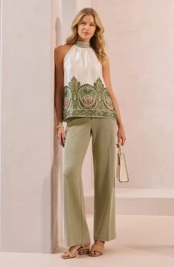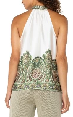 Cream Olive Paisley Print Mock Neck Halter TopÂ