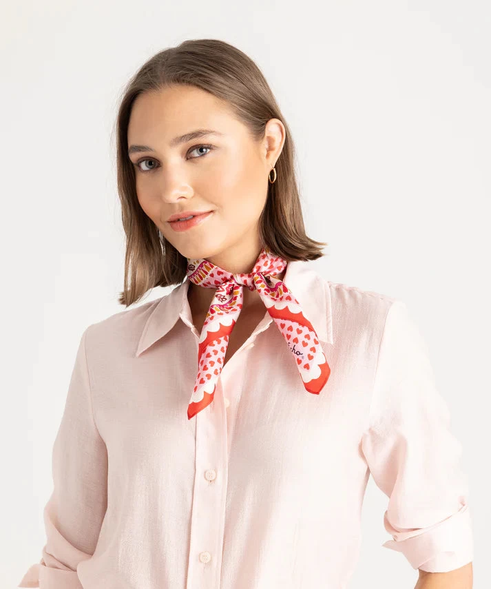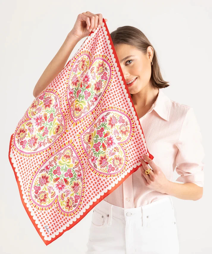 Express your love with this heartfelt style. Gift your sweetie something she will love, a 100% silk bandana overflowing hearts and flowers to symbolize how much you care.