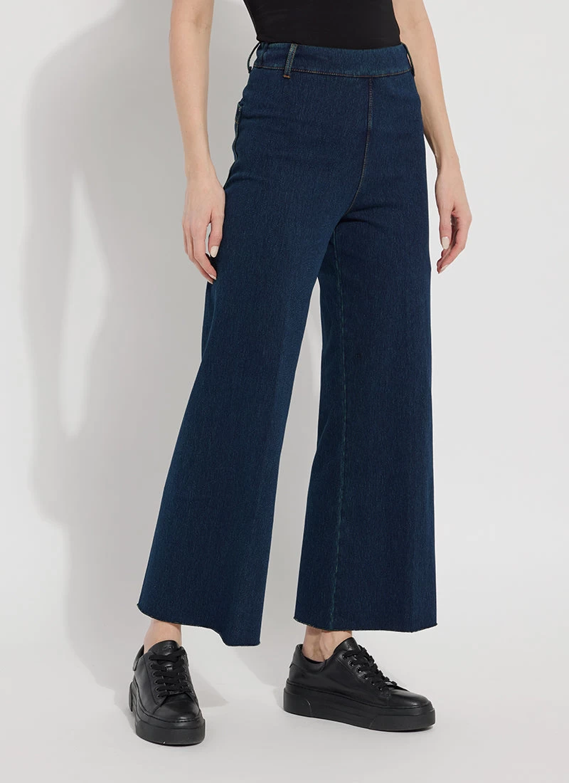 Elevate your denim game with the Erin Hi Waist Wide Leg in Indigo. Made from 4-way stretch Knit Denim, these jeans provide comfort and style. The concealed patented waistband and back patch pockets with gunmetal studs add a touch of sophistication. With an extra-wide leg and cropped, raw-edge hem, these jeans complement any ensemble. Complete your look with a tucked Jodi Slim Button Down, Amelia Moto Jacket, and ankle booties.