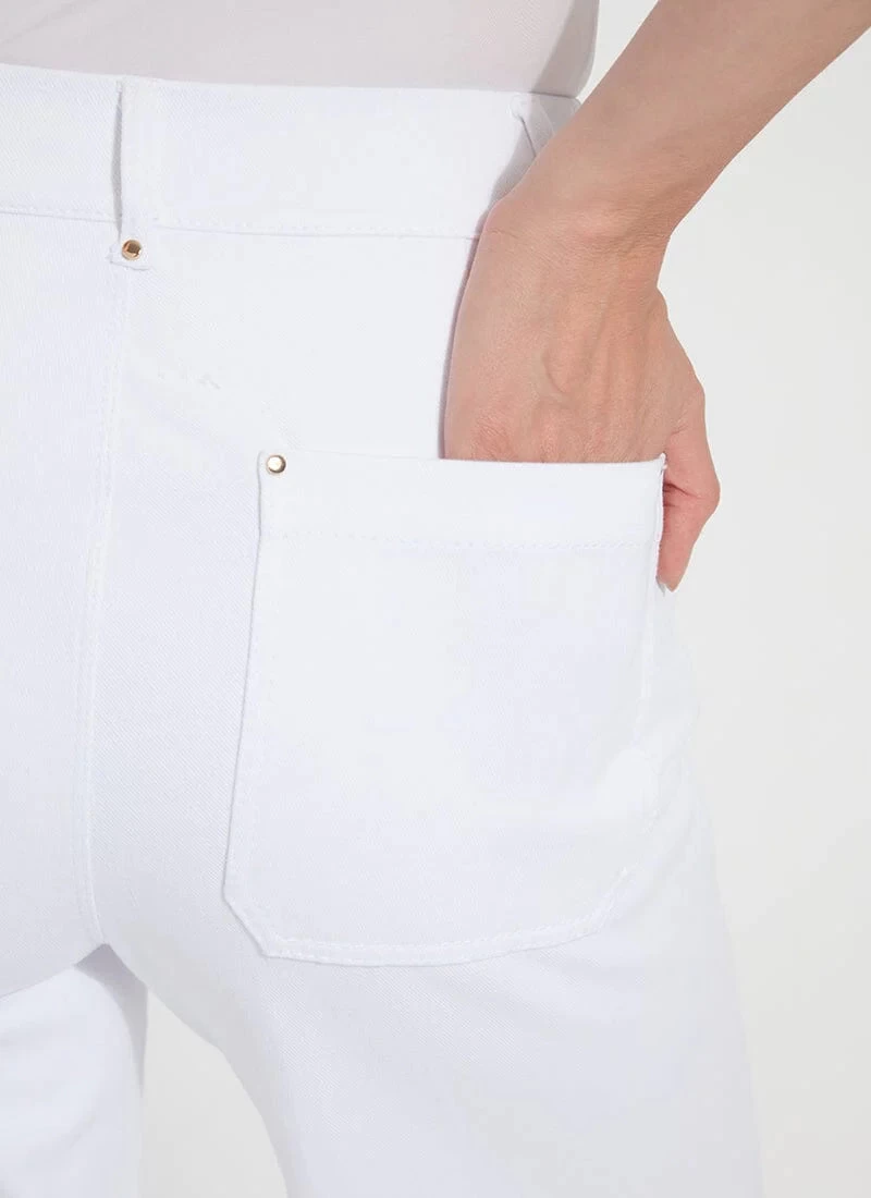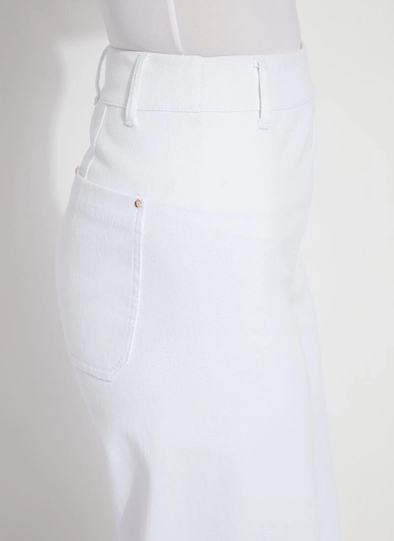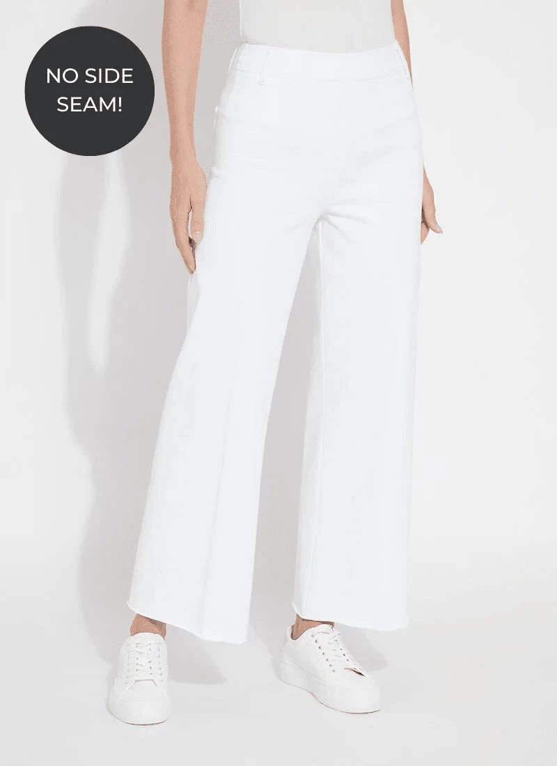 Introducing the Erin High Waist Wide Leg Denim in White. Crafted from 4-way stretch knit denim, these luxurious pants feature a patented concealed waistband, back patch pockets with a center back gunmetal stud, and intricate topstitching. The extra-wide leg, cropped ankle length, and raw-edge hem add an elegant touch to any outfit.