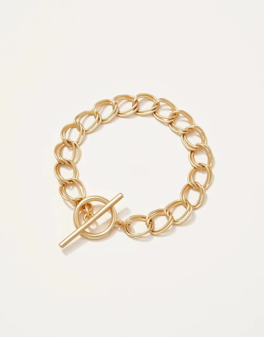 Introducing the Everly Toggle Bracelet, designed to elevate any ensemble. Crafted with Matte 18kt Gold Plating, this timeless double curb chain piece effortlessly complements any outfit. For a trendy layered look, pair it with bold bangles or stretch bracelets. Versatile and stylish, the perfect addition to your jewelry collection.