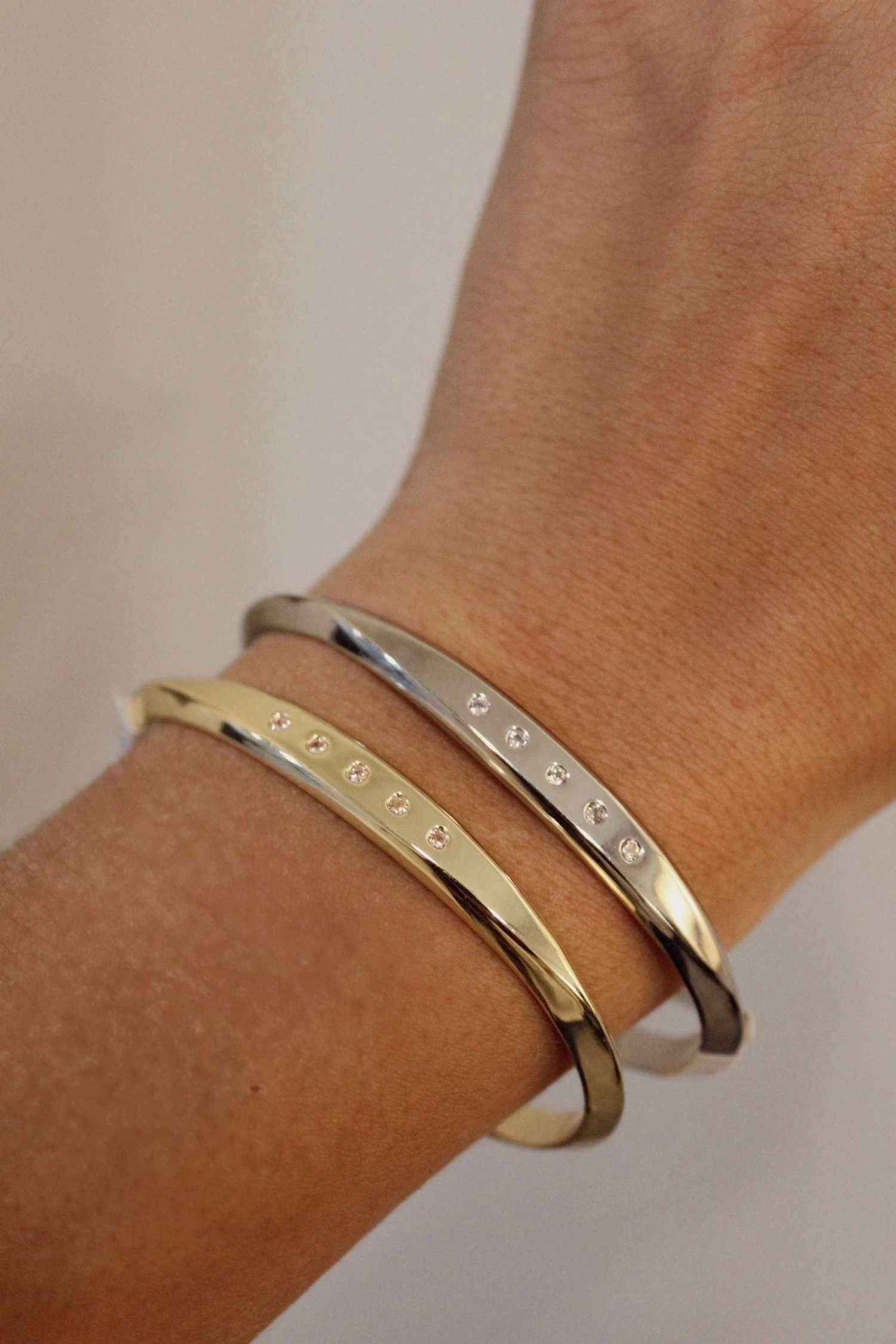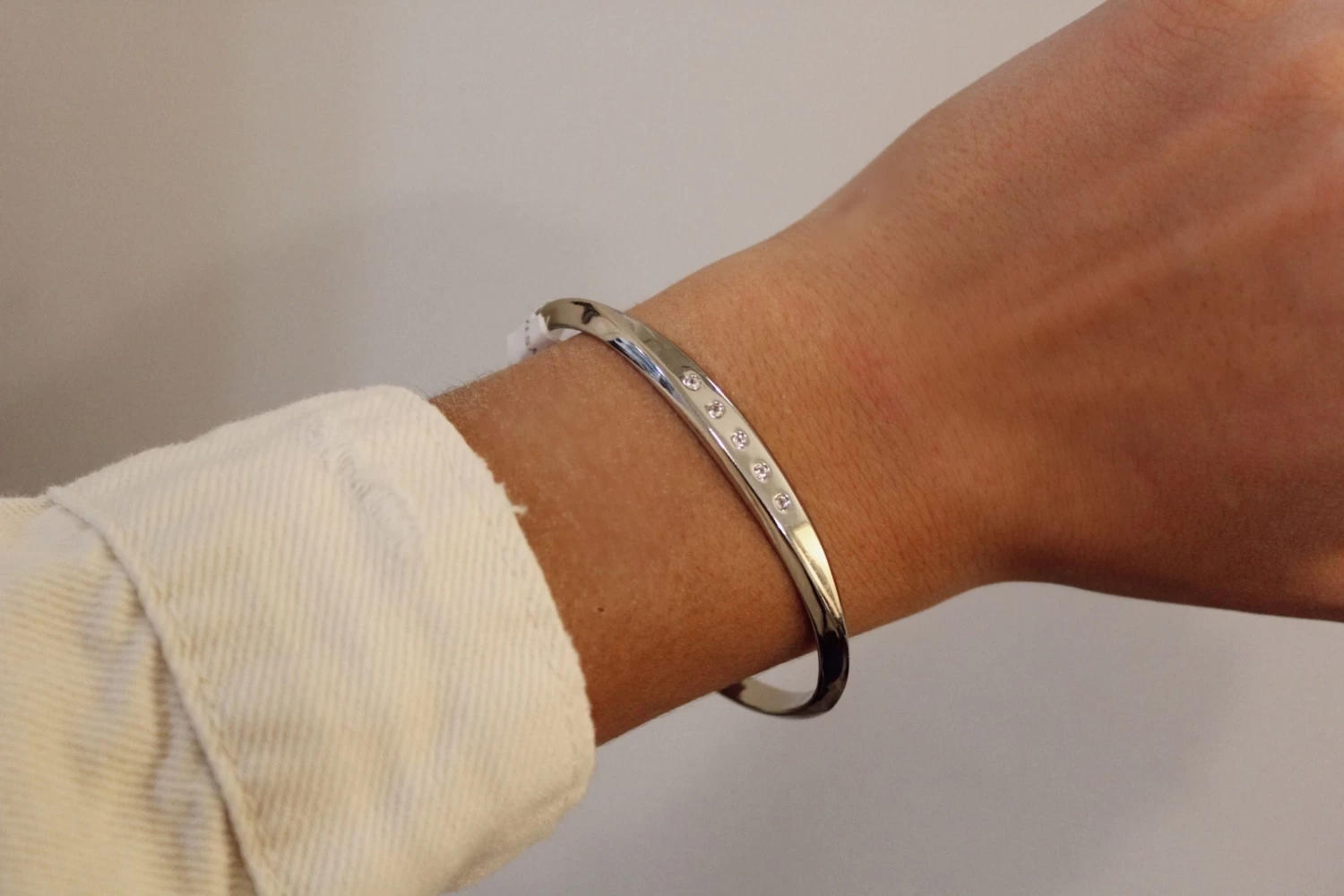 Sleek and sophisticated to elevate your look. The Flat Face Cuff with Crystals features a minimalist design for maximum style and elegance. The flat face is adorned by sweet and subtle crystal detailing, adding a touch of glamour to this already stylish piece. With immense versatility, wear this bracelet alone or stacked with other bangles and cuffs for a bold statement.