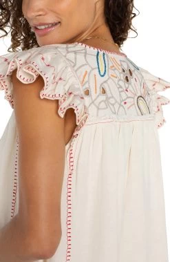 Indulge in the ethereal beauty of our Flutter Sleeve V-neck Blouse. The delicate flutter sleeves and charming embroidery add a touch of whimsy, while the raw fray hem brings a relaxed vibe to this versatile piece. Perfect for warm days or layering under a jacket, it exudes effortless style. Available in bone with multi embroidery.