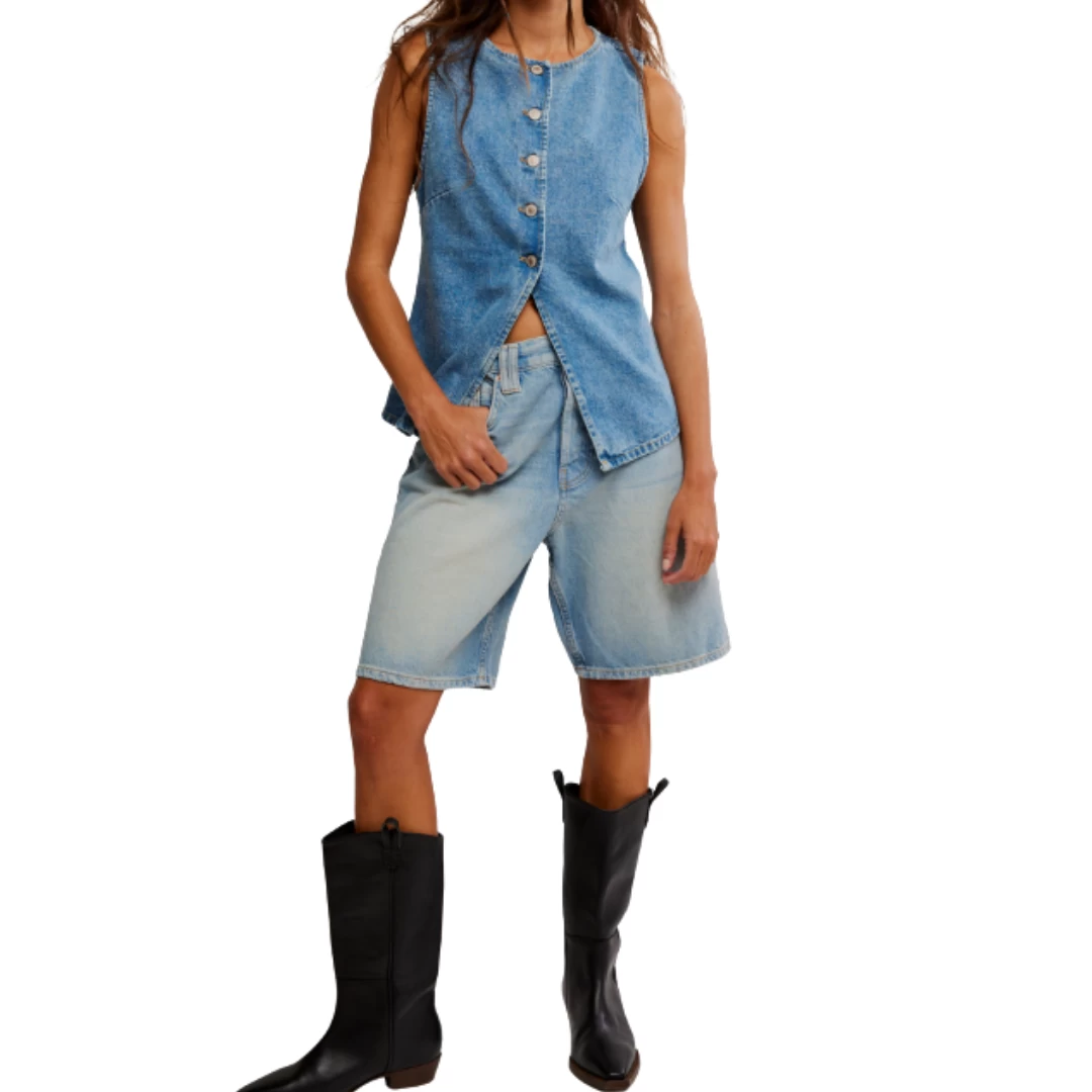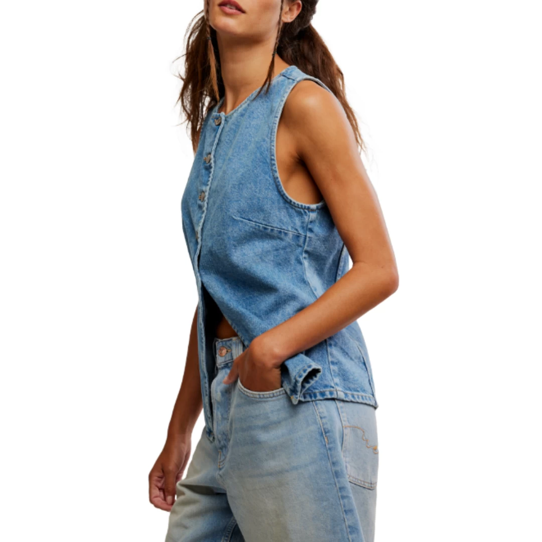 Silhouette is everything with this simple denim vest from We The Free, featured in a crew-neck style with intentional darting, summarys down the front, and a flared hem for an ultra-flattering fit.