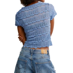 Elevate your outfit with the Allure Blue Angelina Lace Tee. Its fitted, shrunken fit and delicate lace and mesh fabrication create a romantic feel. The striped pattern, short sleeves, and crew neckline add a touch of sophistication, while the scalloped trim exudes luxury. Your new go-to for an effortlessly elegant look.