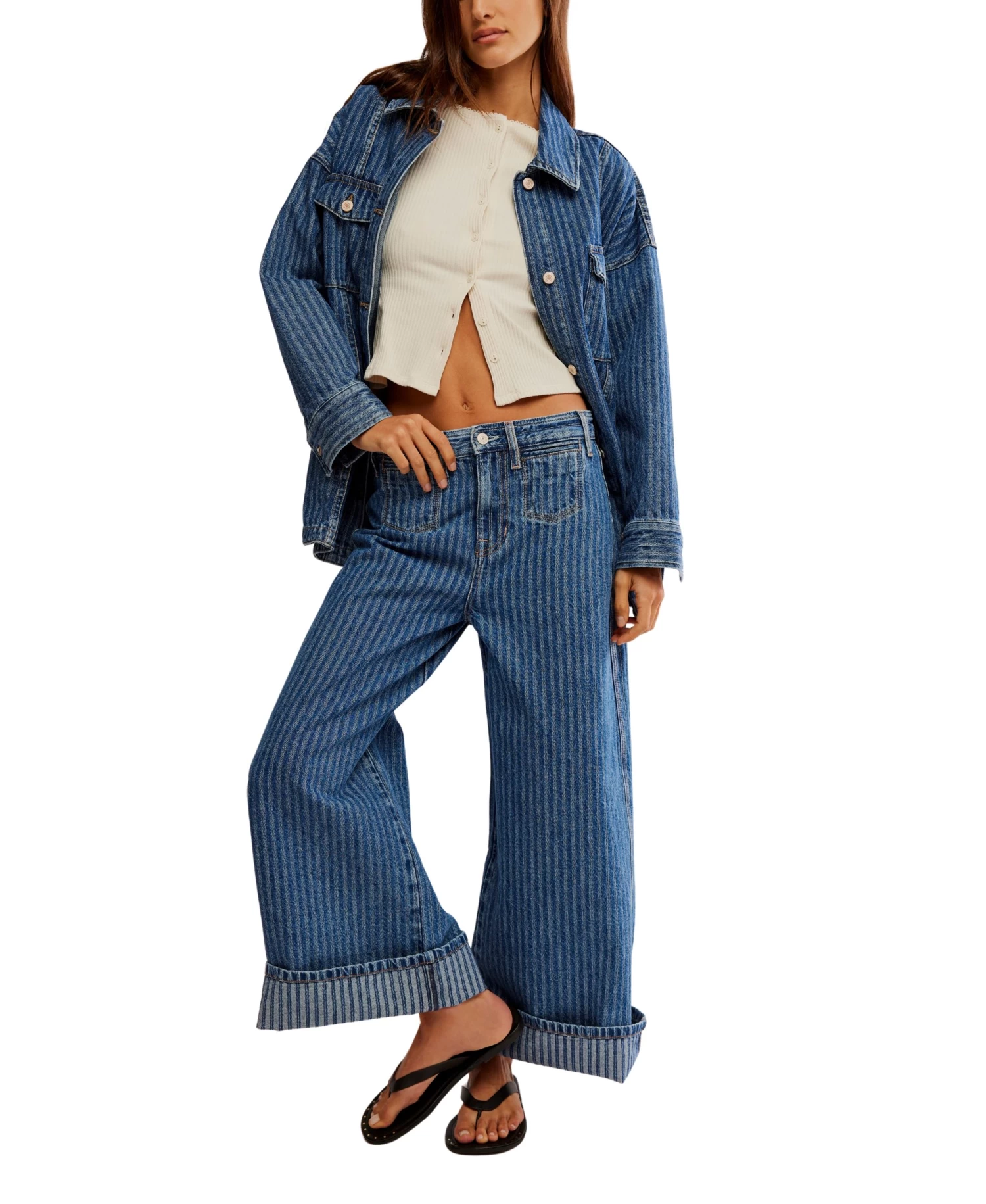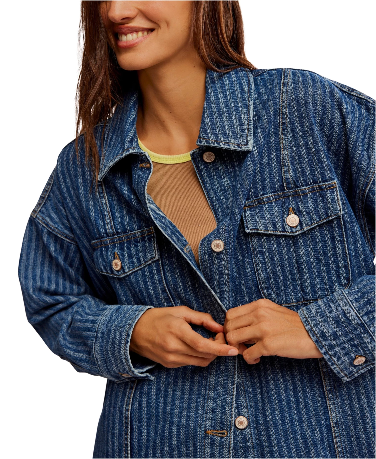 Introducing the Blue Abyss Dune Shirt Jacket – a striking combination of effortless cool and timeless style. Its relaxed, oversized fit, washed denim fabric, summary-front closure, and flap chest pockets make it the perfect addition to any outfit. With faded stripes and drop-shoulder sleeves, this jacket exudes sophistication and versatility. A must-have for year-round layering.
