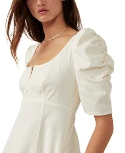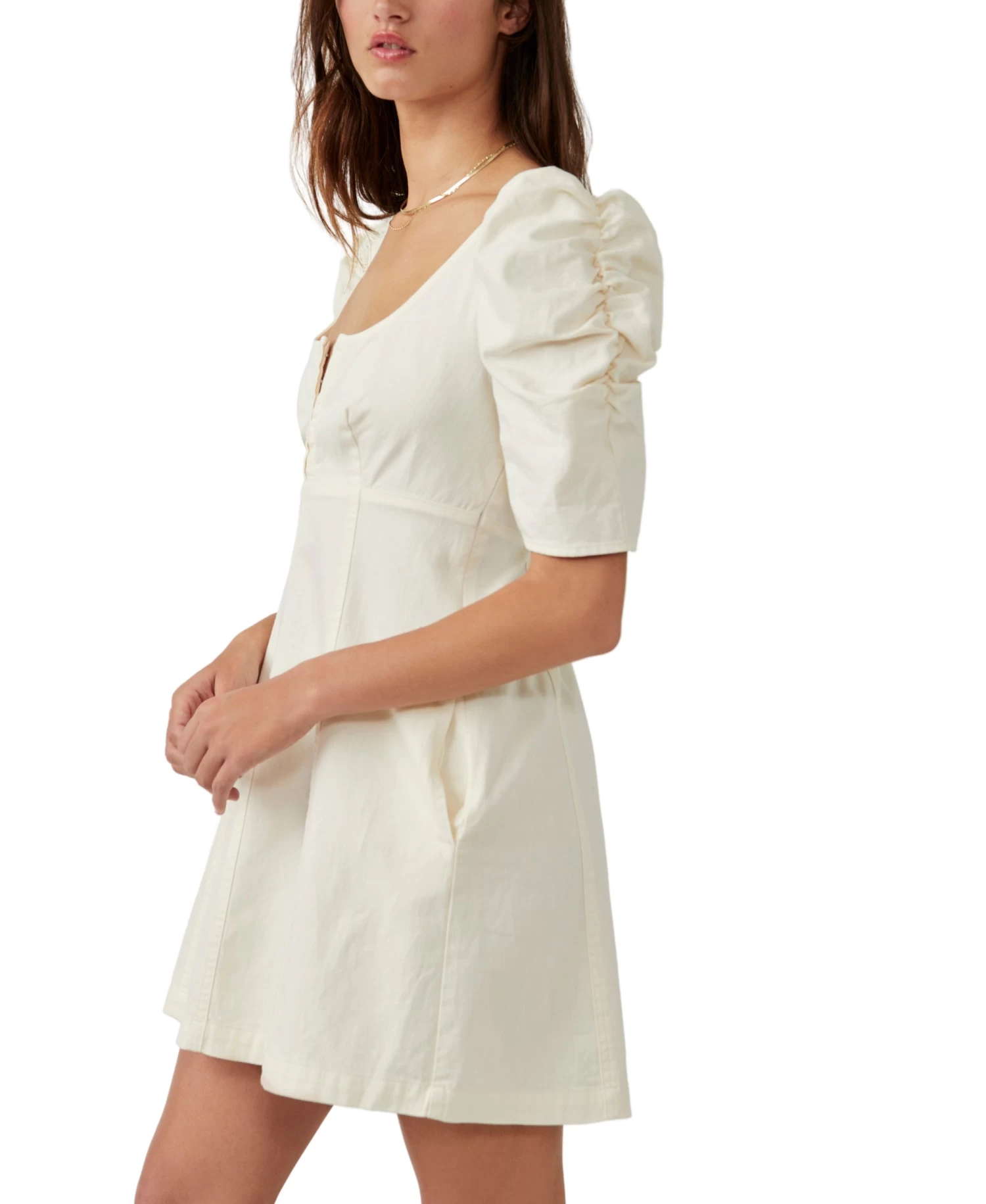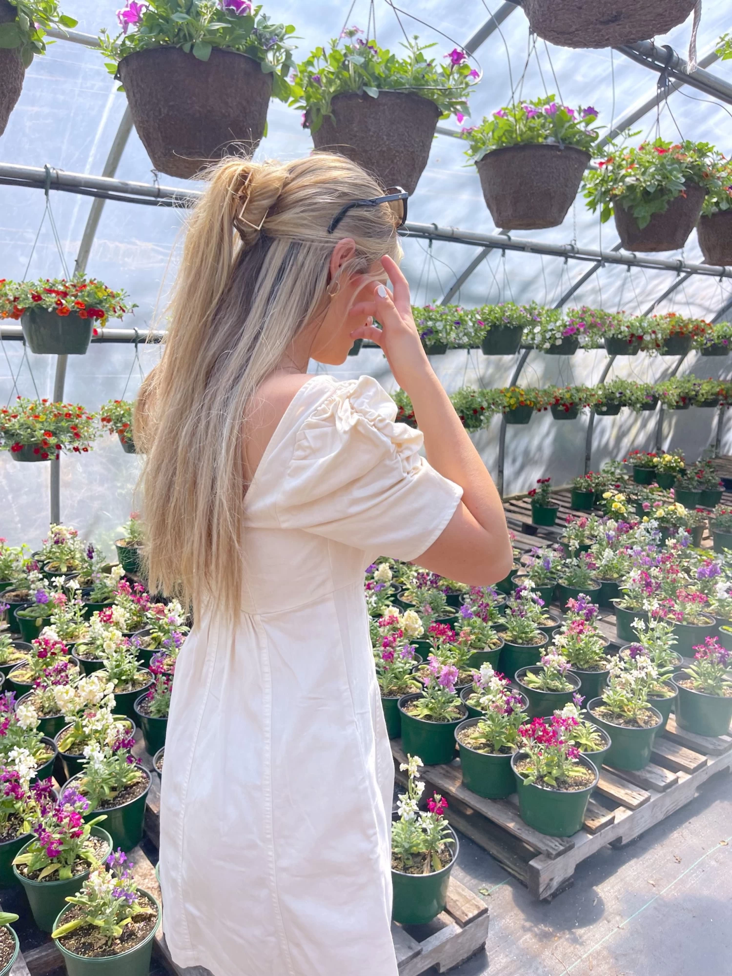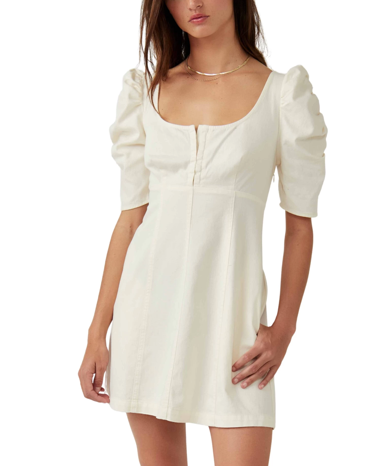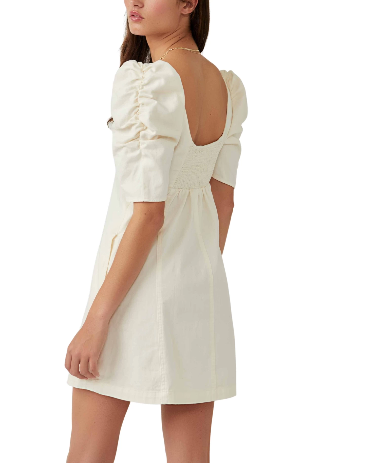 Your new go-to summer dress. Crafted from high-quality white denim, the Cheyenne Denim Mini boasts a flattering scoop neckline and a front summary closure, making it easy to style. But the true standout features of this dress are the trendy puff sleeves with ruched details that add a touch of femininity to the overall look. To complete the piece, this mini dress features smocking at the back for added comfort and a customized fit. So whether you’re headed to a summer party or simply running errands around town, you can rock this dress all day long with ease!