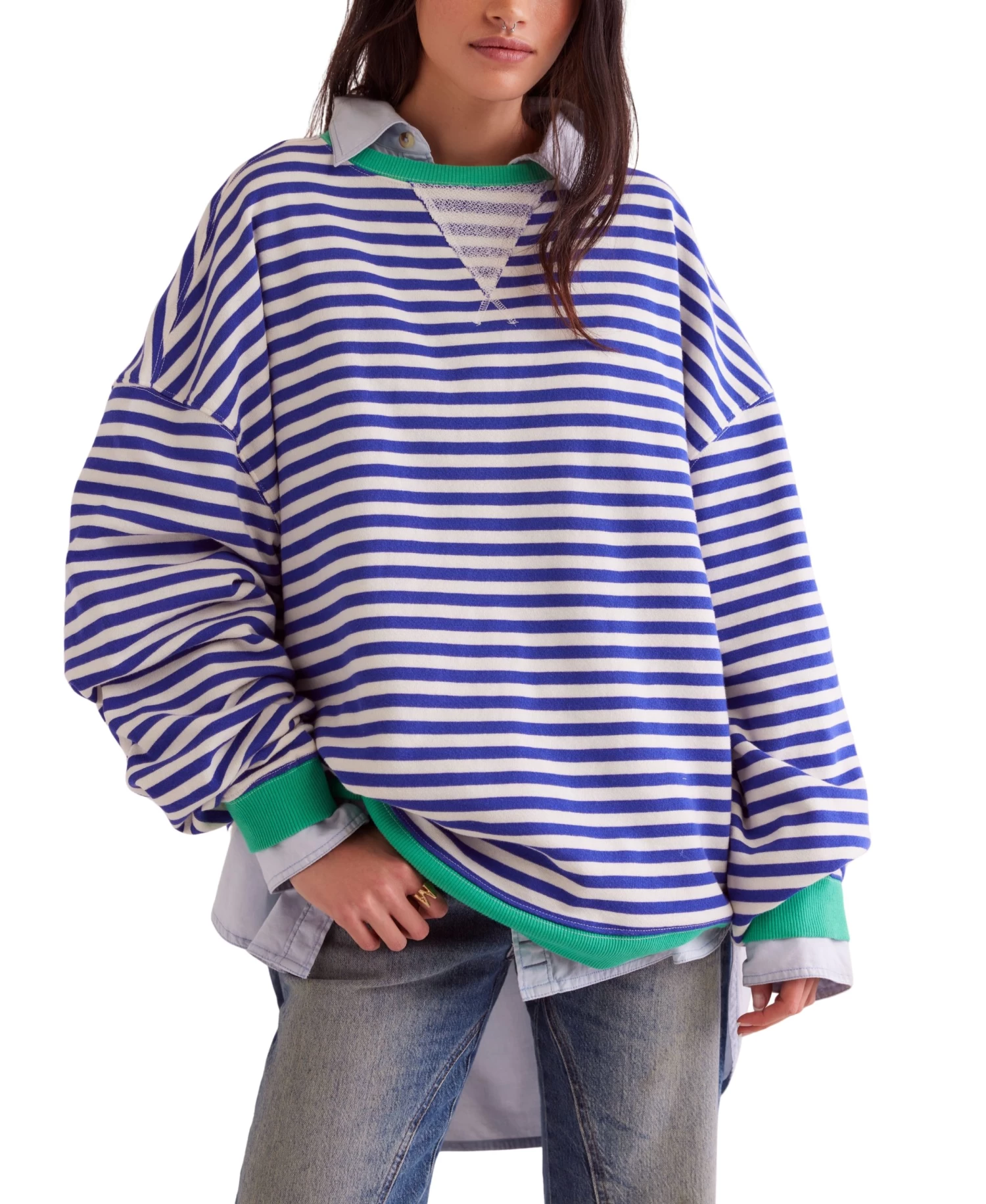 Elevate your wardrobe with our Classic Striped Crew in Sand Dollar by Free People. This timeless piece features a relaxed, oversized fit with a crew neckline and dropped shoulders for a slouchy silhouette. The staple striped print and contrasting hems add dimension, making it perfect for layering or wearing solo. A sophisticated and exclusive addition to your collection.