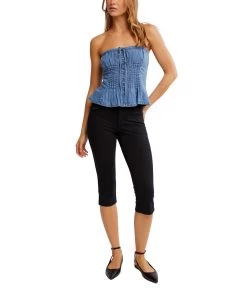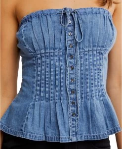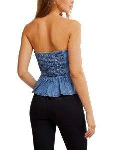 Elevate your wardrobe with our Denim Wink Wink Tube top by Free People. Crafted from washed denim, this strapless top features pin-tucked details and slotted accents for a unique touch. The fit-and-flare, semi-cropped silhouette is accentuated by a flared peplum hem and smocked backing. Perfect for a denim-on-denim look, it also has a summary-front closure and tie detail.