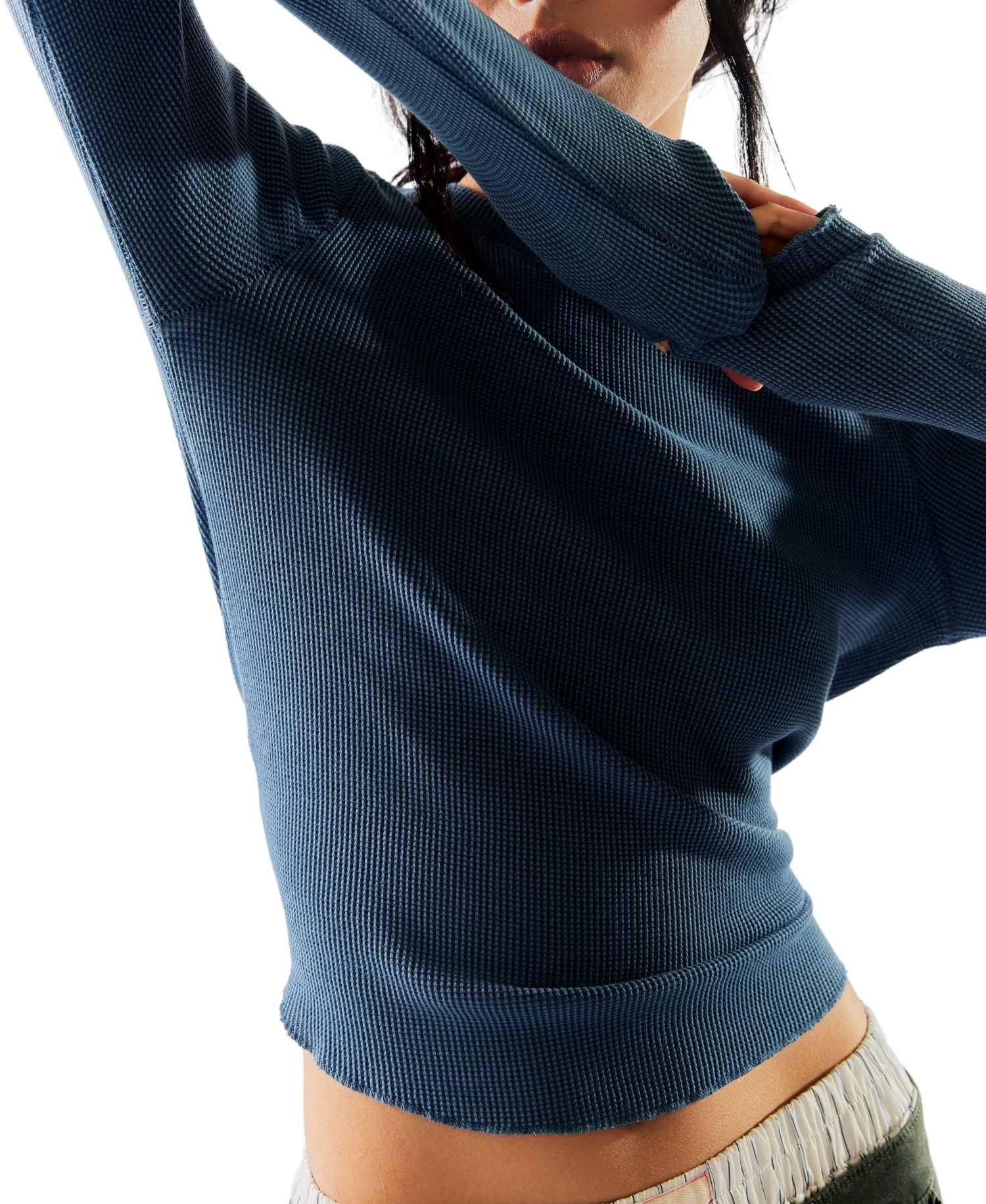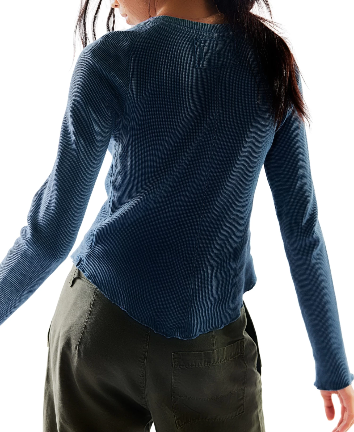 Indulge in the luxury of comfort with our Easy Does it Tee in Blue. Made from a soft waffle-knit fabric, this long-sleeve shirt features a relaxed fit, raglan-cut sleeves, and delicate lettuce-edge trim. Experience effortless style and sophistication in this wardrobe essential.