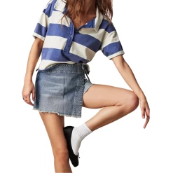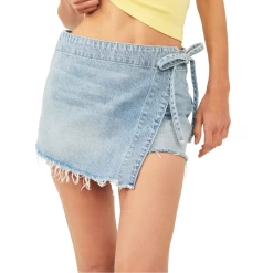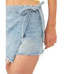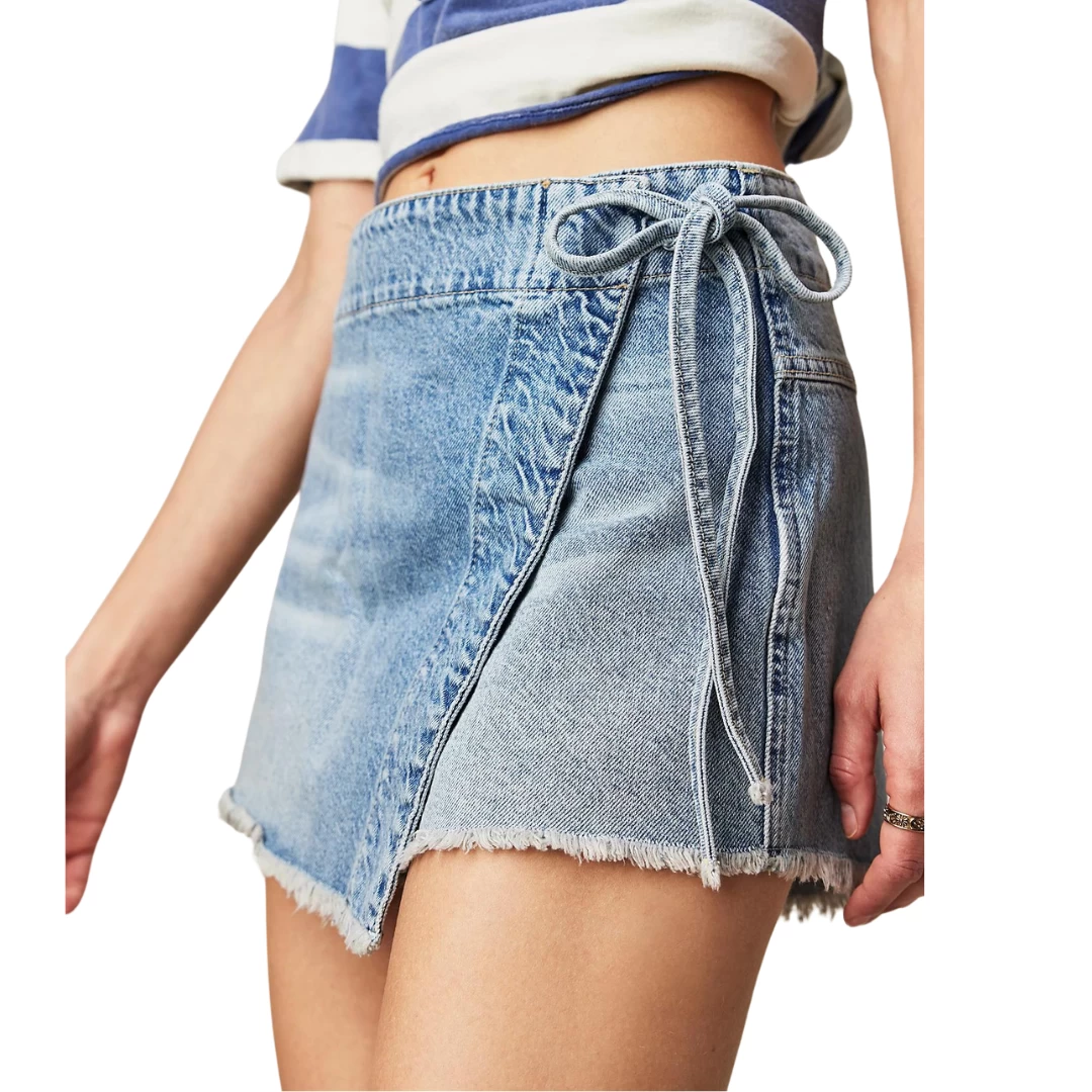 Indulge in effortless elegance with our Emmy Denim Skort by Free People. This classic and versatile piece features a high-rise fit and asymmetrical design with raw-edge hemline. Plus, the back pouch pocket and back yoking seams provide both functionality and shape for a touch of edge. Experience luxury and style in one.