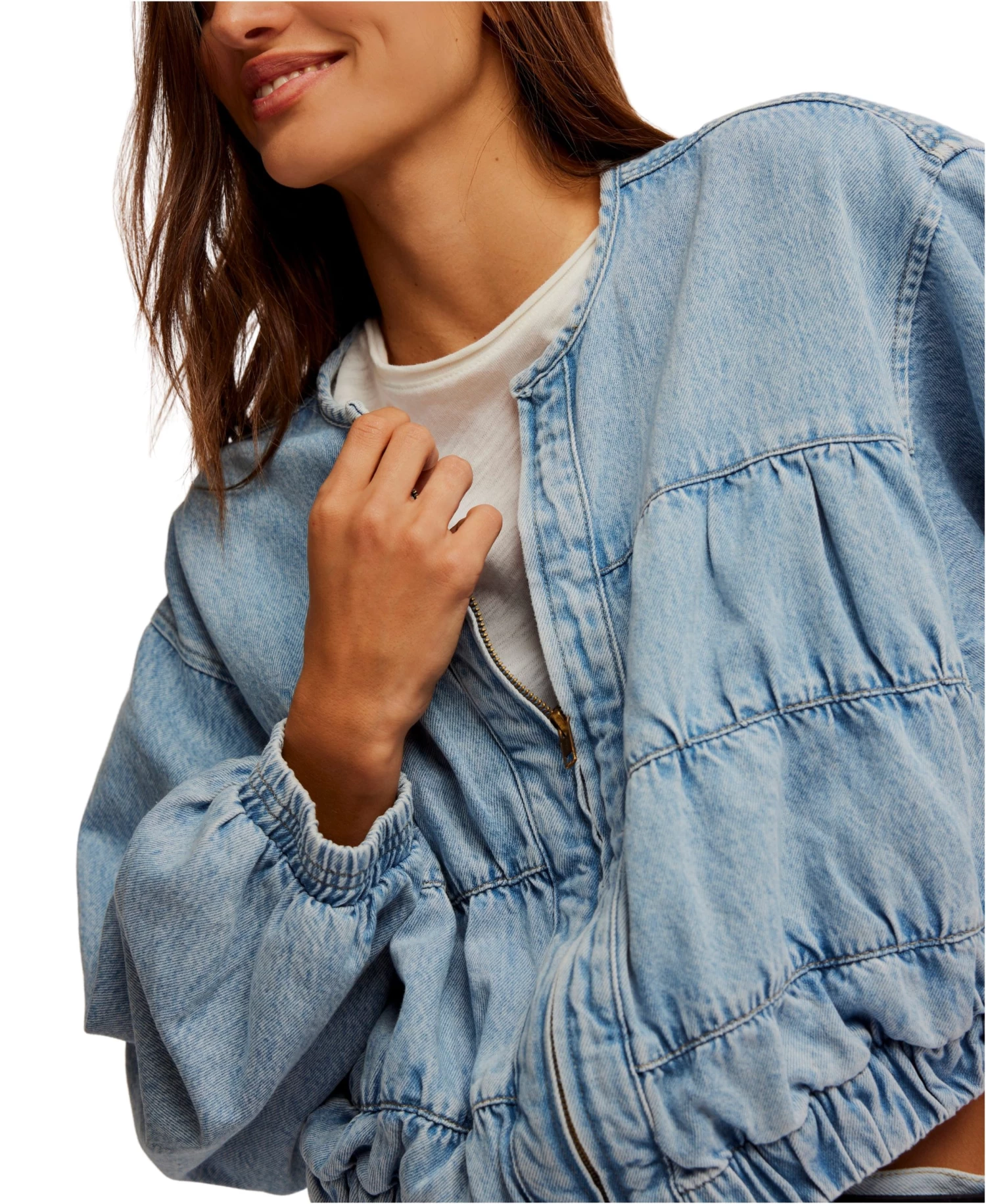 Indulge in the perfect combination of vintage and modern with our Layla Denim Jacket by Free People. Its washed denim fabrication, collarless design, and ruching details create a sophisticated and elegant look. The elasticated hem and cuffs add a touch of texture, making this cropped jacket a must-have for any fashion-forward wardrobe. Elevate your style with the Layla Denim Jacket.