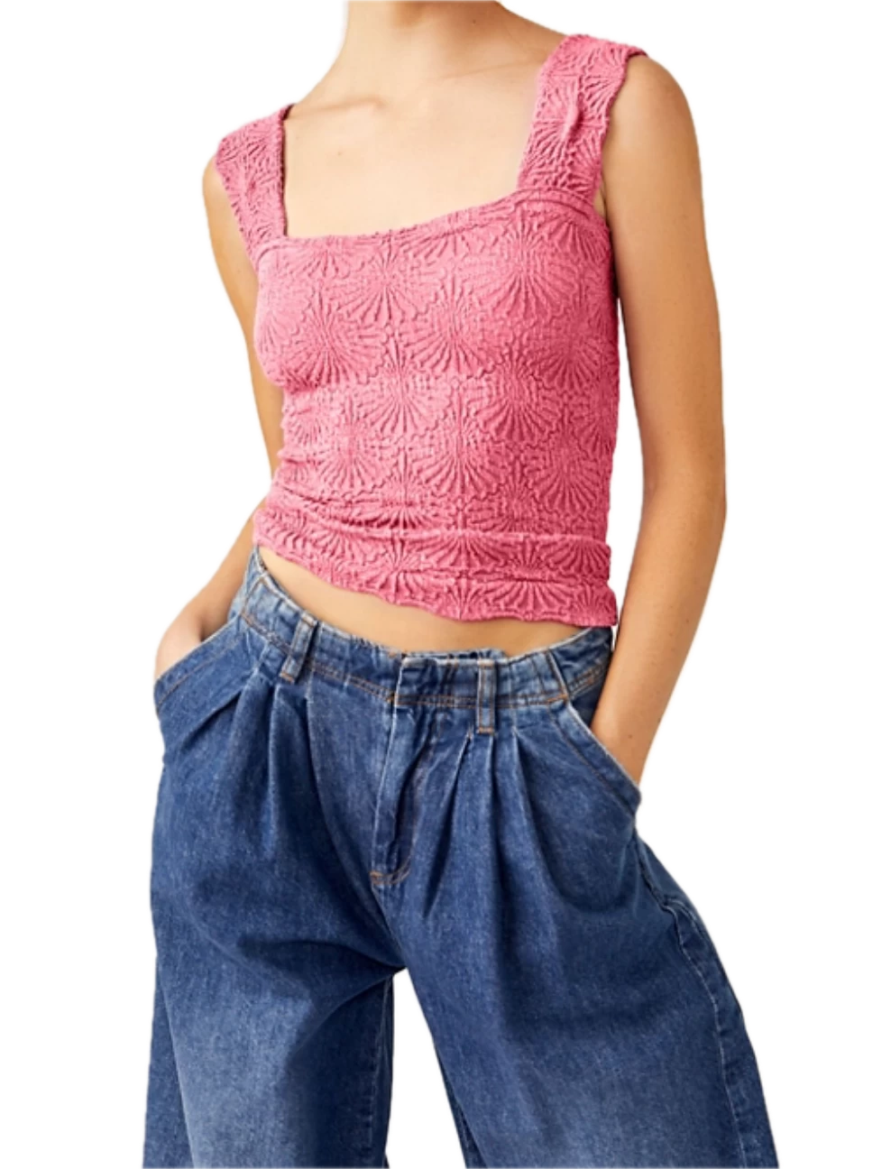 The Love Letter Cami in Confetti by Free People is a sweet, cropped cami with a square-neck silhouette and a jacquard floral design. It features a statement lettuce-edge hemline, pull-on design, stretch fit, and wide straps for a comfortable and flattering fit.
