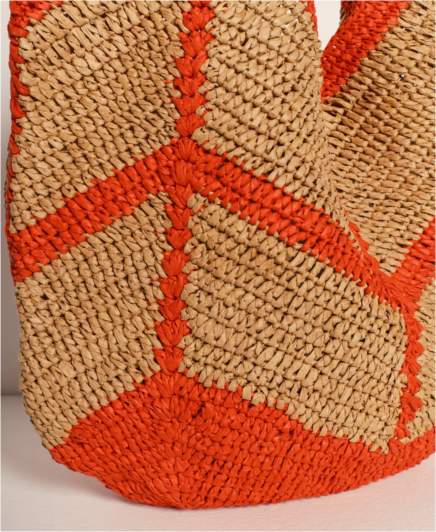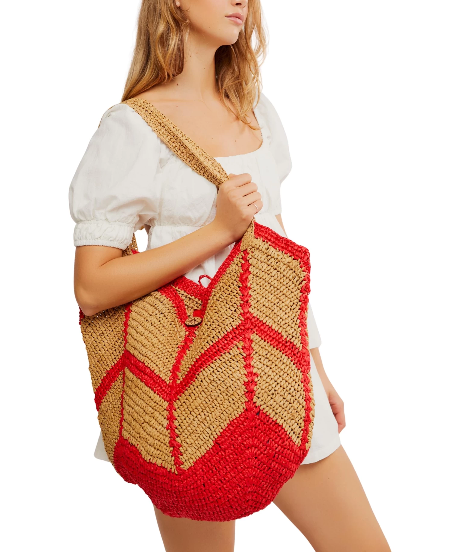 Embrace effortless elegance with our Red Orange Mykonos Straw Tote by Free People. It is a perfect transition from the beach to the city with its chic chevron stripes and spacious interior. Crafted with top carry handles for easy, stylish transport. Take on your next vacation in luxury.