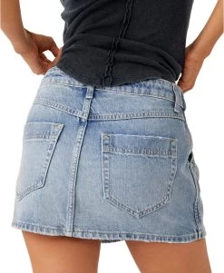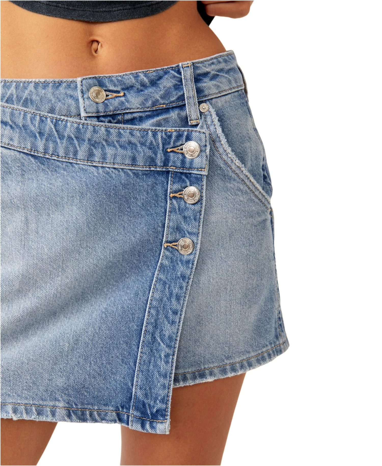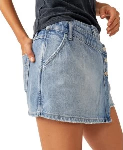 The Wynne Denim Skirt in Light Indigo by Free People combines classic style with a modern twist. Featuring a mid-rise, asymmetrical wrap silhouette, side summary closures, and a five-pocket design, this rigid denim skirt is perfect for any occasion. Subtle distressing adds a vintage feel, while its versatility makes it easy to pair with tall boots or sporty sneakers for a chic or casual look.