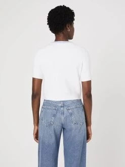 Elevate your style with our Sky Blue Babysoft Short Sleeve Top by French Connection. Made from a luxurious lightweight knit, this top boasts elegant white trim and two front pockets for a touch of sophistication. Perfect for any occasion, it effortlessly blends comfort with chic. Add a touch of charm to your wardrobe today.