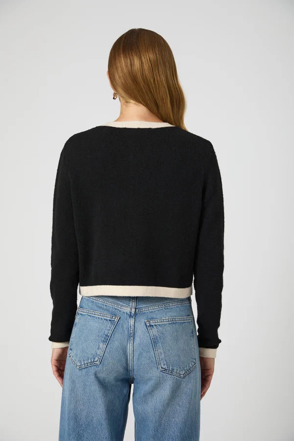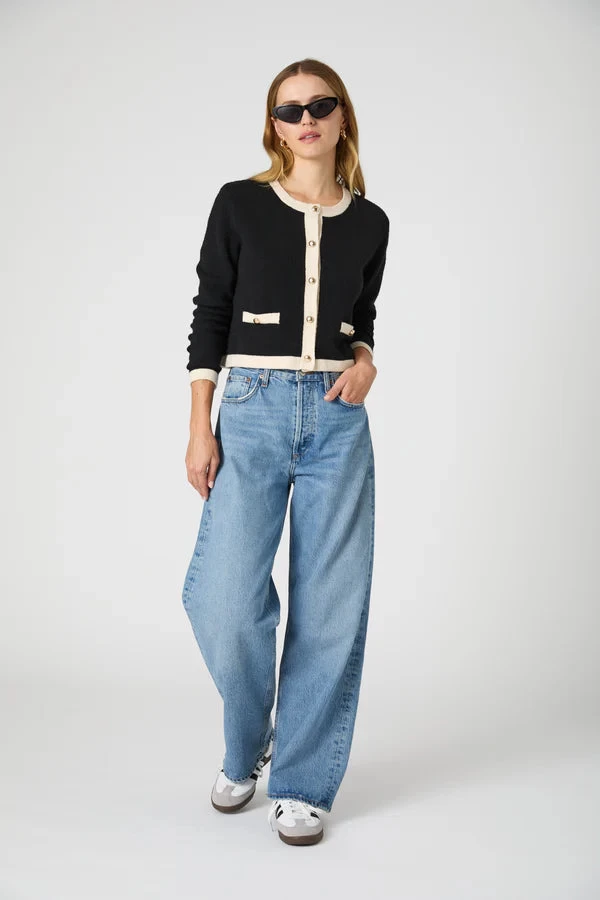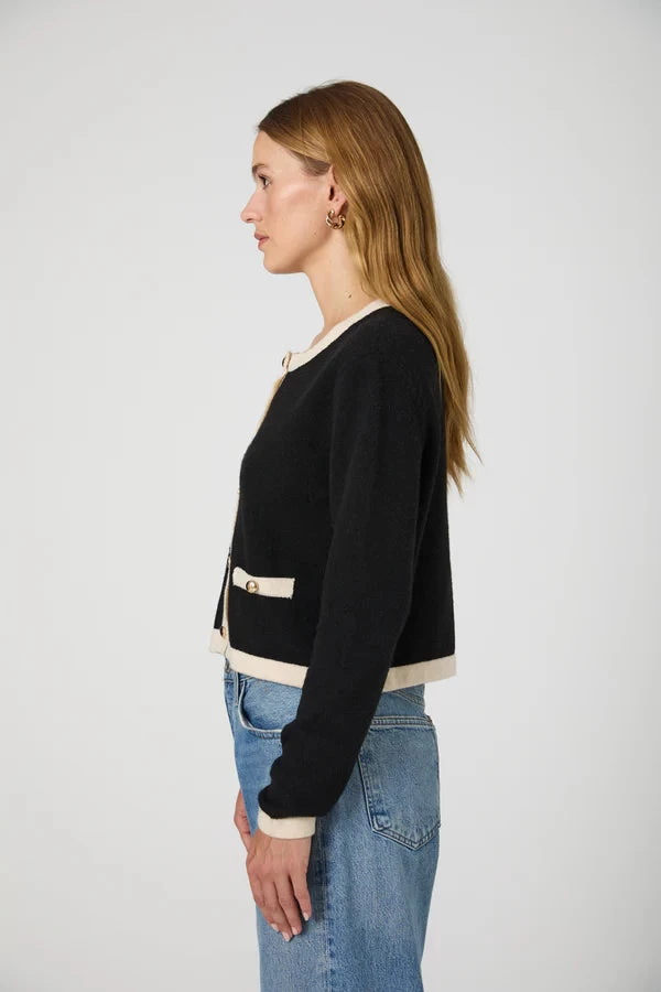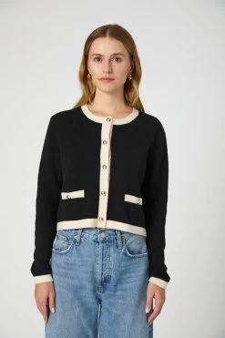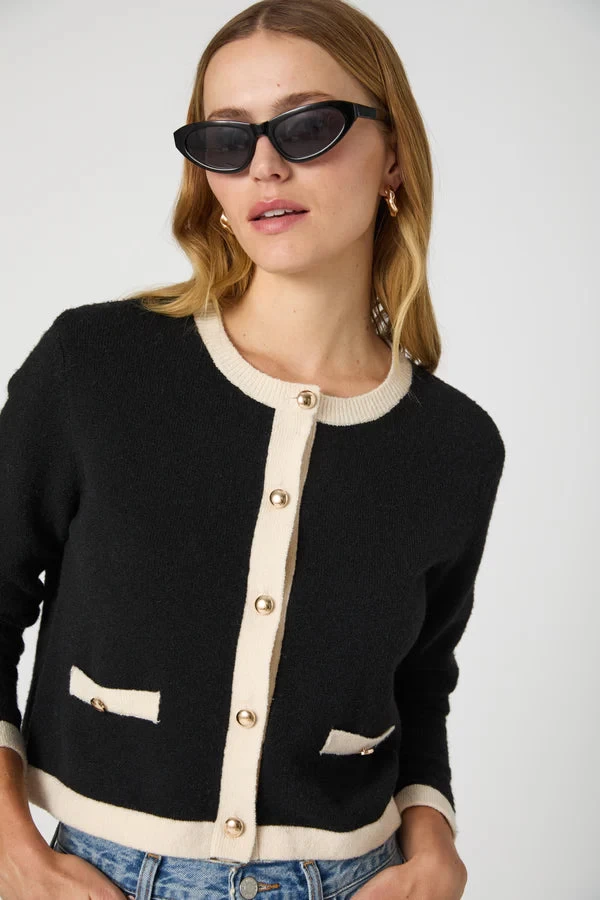 Indulge in luxury this season with our Vhari Contrast Cardigan in Black by French Connection. The soft and cozy design boasts contrast trims and gold summary-up fastenings, making a simple yet sophisticated statement. With long sleeves for added warmth, this cardigan is a must-have for any stylish wardrobe.