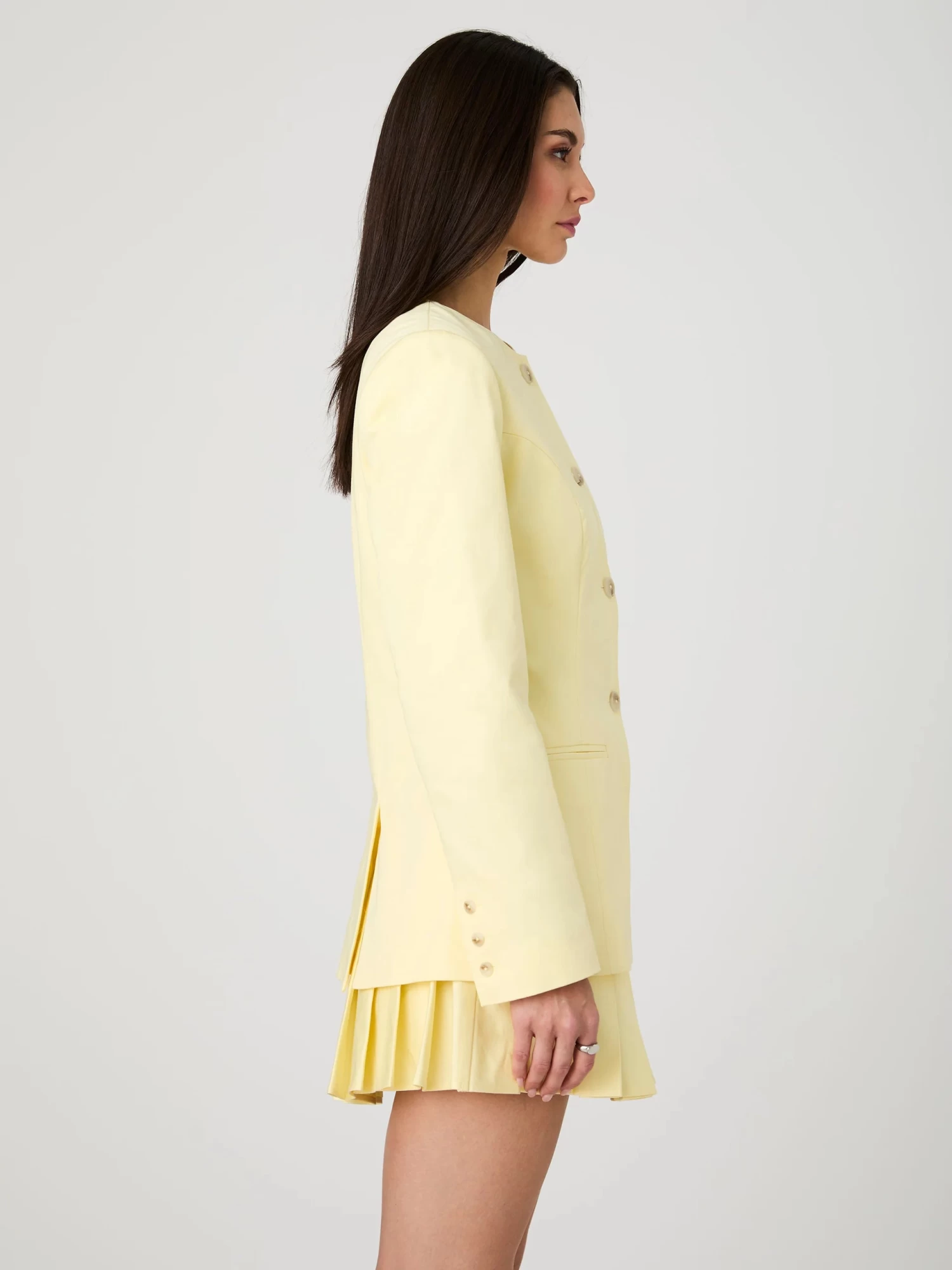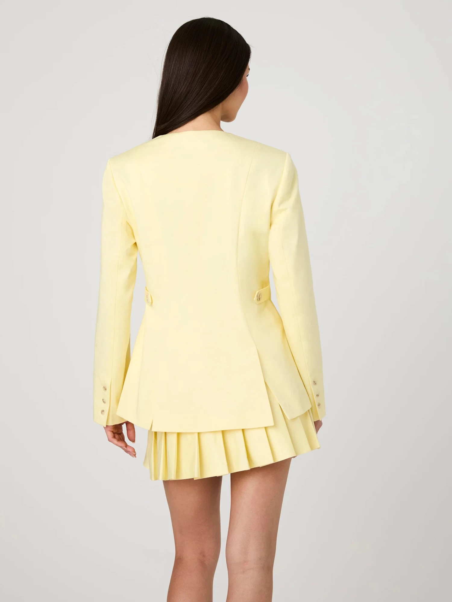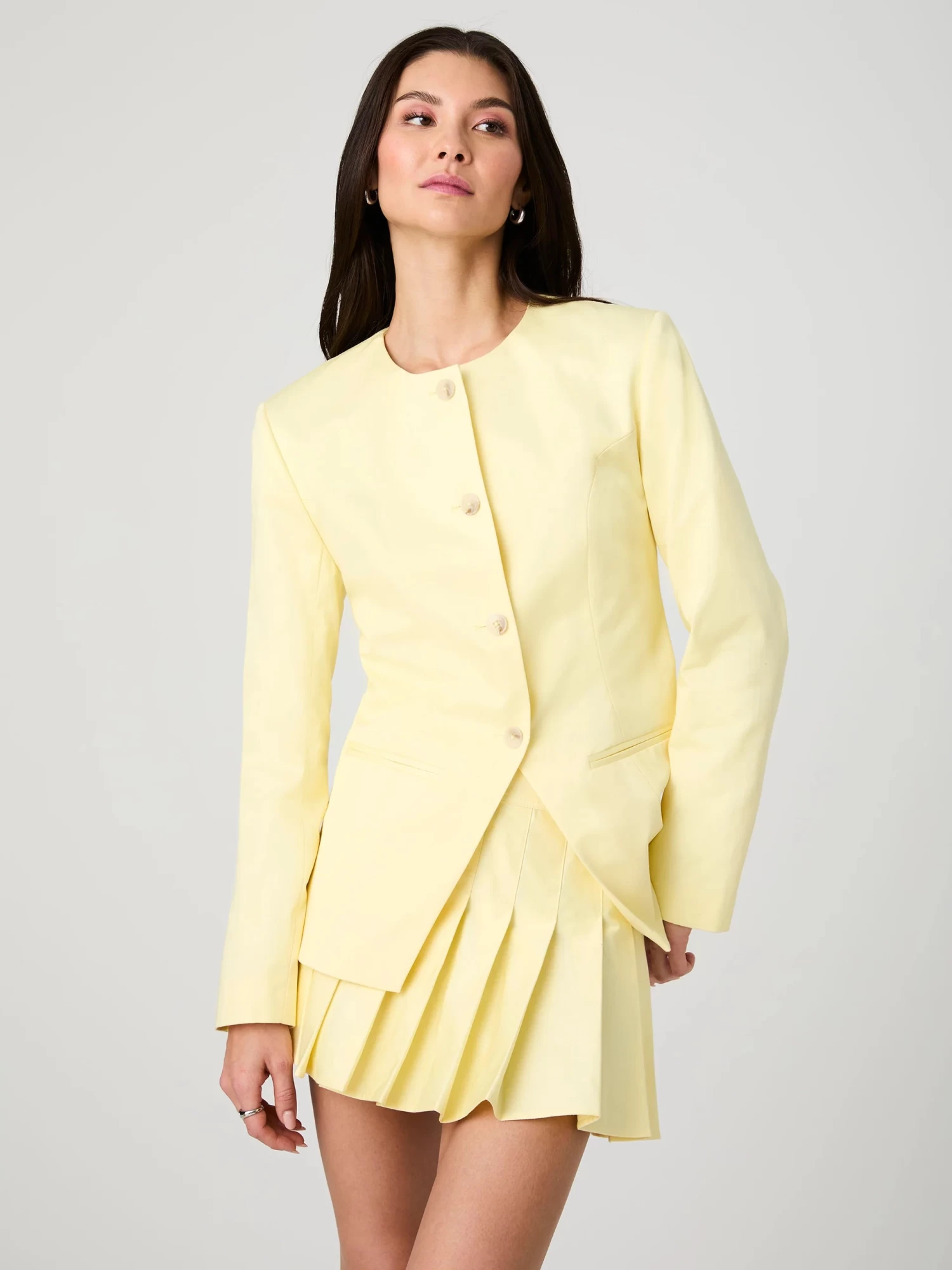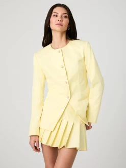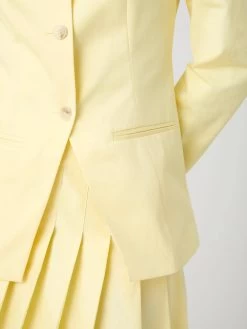 Introducing the Yellow Sabine Twill Jacket by French Connection. This sleek and modern slim-fit jacket is crafted from structured cotton twill suiting fabric, featuring a round neckline, double welt pockets, and a tailored back tab. Its thoughtful details and versatile design make it the perfect addition to your wardrobe. Suit yourself in style.