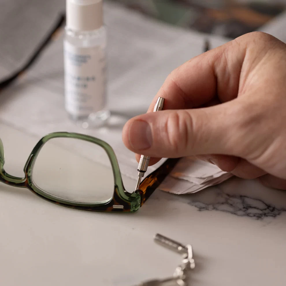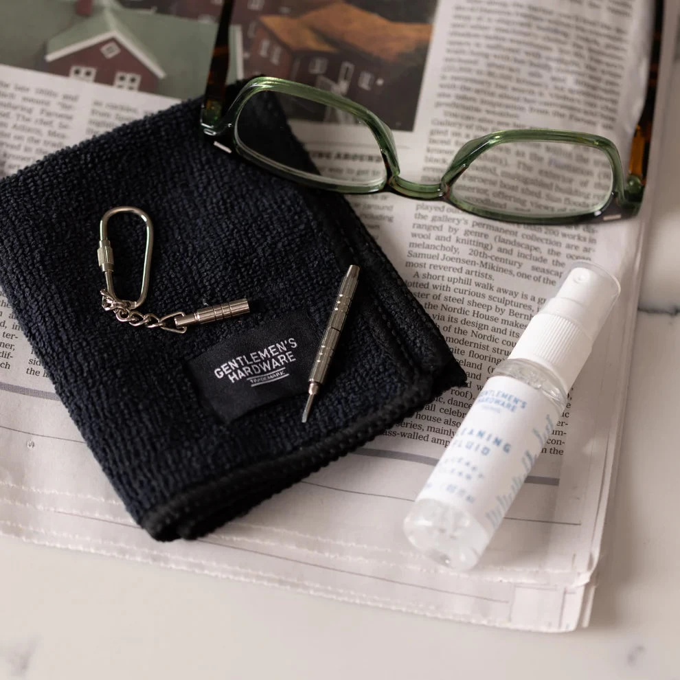 Revive your devices and glasses with the chic Squeaky Clean And Repair Kit. A sleek tin encases a cleaning spray, cloth, and mini screwdriver for quick, stylish solutions to smudges and repairs. Perfect for on-the-go maintenance, for a polished look and crystal-clear screens.
