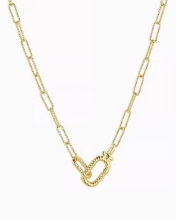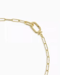 The Gold Crew Link Necklace features a stylish interlocking link design with a convenient push hinge closure, making it easy to wear and perfect for layering with your favorite necklaces. Crafted from 18k gold, this necklace boasts beautiful textured details that add a touch of elegance to any outfit. We love it layered with shorter, dainty gold chains for an effortless, everyday look. This 18k gold interlocking link chain brings both texture and shine, making it the perfect finishing touch to elevate your daily style.