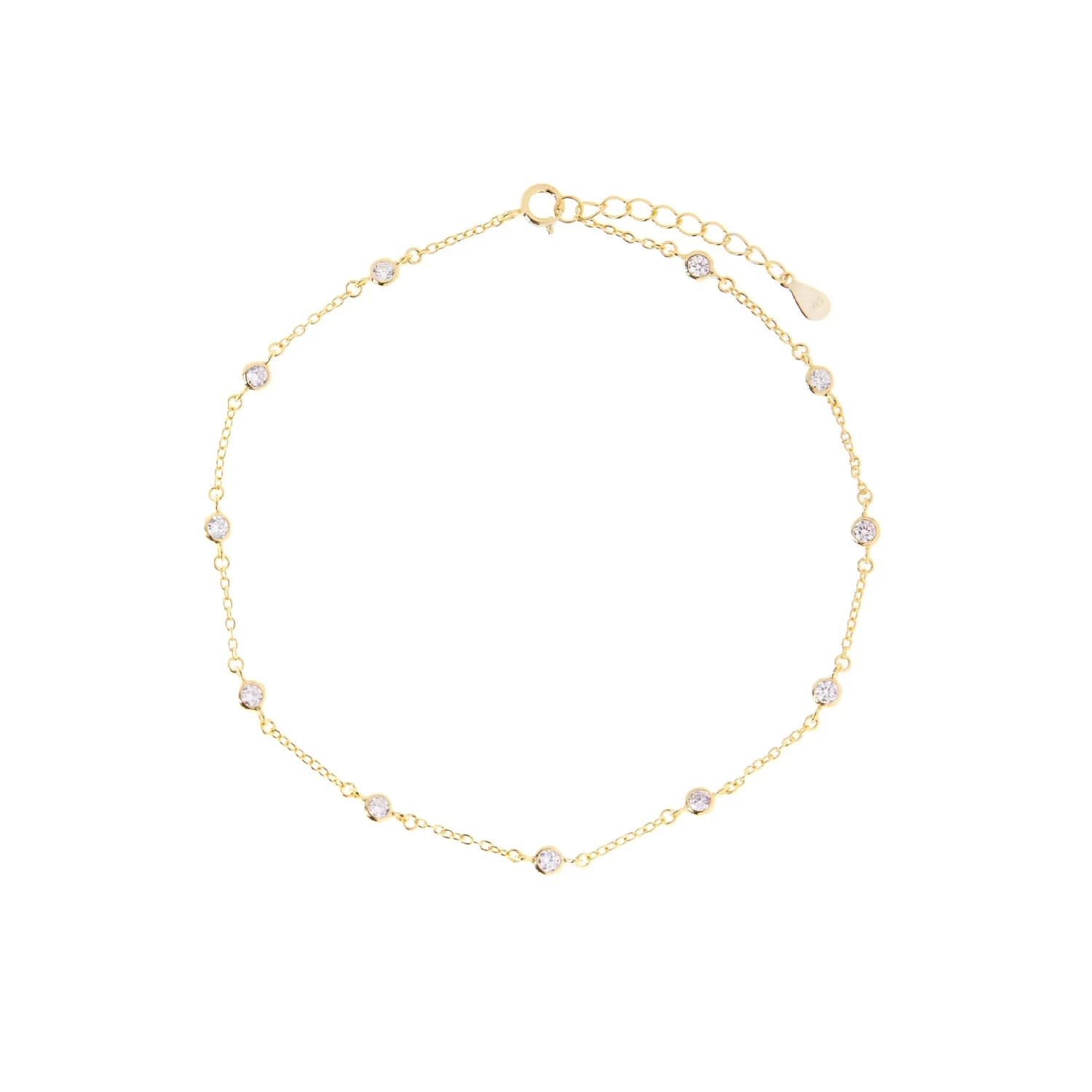 Adina Eden’s Gold Diamond By The Yard Anklet, crafted from sterling silver and plated in gold, brings a touch of effortless elegance to your ankle. Adorned with delicate clear cubic zirconia stones, this anklet sparkles subtly with every step. Measuring 9 inches with an additional 1-inch extender, it offers an adjustable fit for versatile and comfortable wear. Perfect for adding a hint of glamour to your everyday or special occasion look, this anklet is a chic, timeless addition to your jewelry collection.