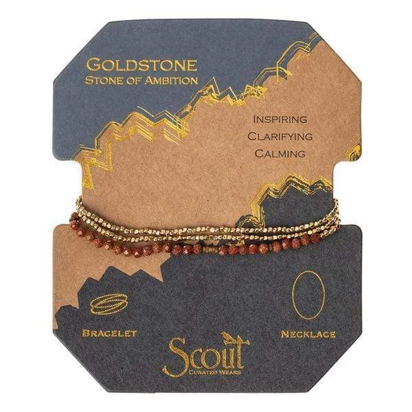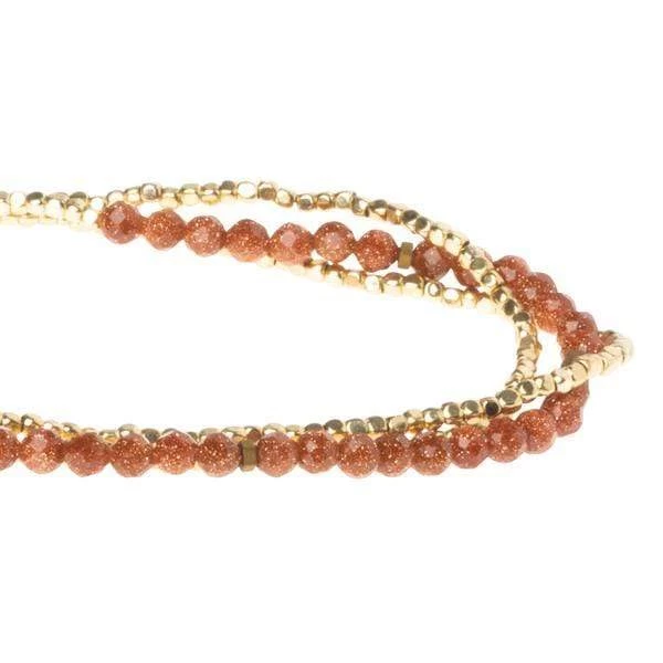 Inspiring, Clarifying and Calming. This goldstone beaded wrap, wraps as a bracelet 3 times or wear as a single strand necklace. It’s made from semi precious gemstone beads, plated brass, stretch cord. Goldstone healing properties are present when you where this gemstone jewelry. It’s known as the stone of ambition and is said to help attain one’s goals. Goldstone is also said to help one stay calm and stabilize the emotions.Â