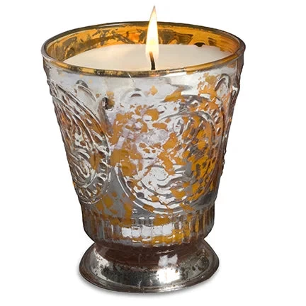 Elevate your home decor with the Grapefruit Pine Fleur de Lys Candle, a timeless embodiment of French elegance. Crafted from silvered and antiqued glass, these exquisite candles feature an intricately embossed fleur de Lys pattern atop a graceful pedestal base.Â