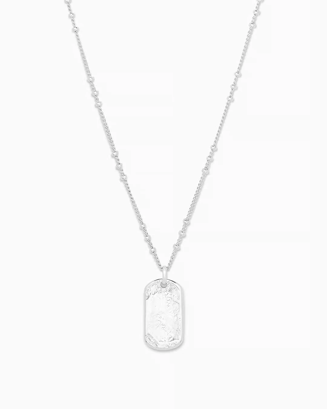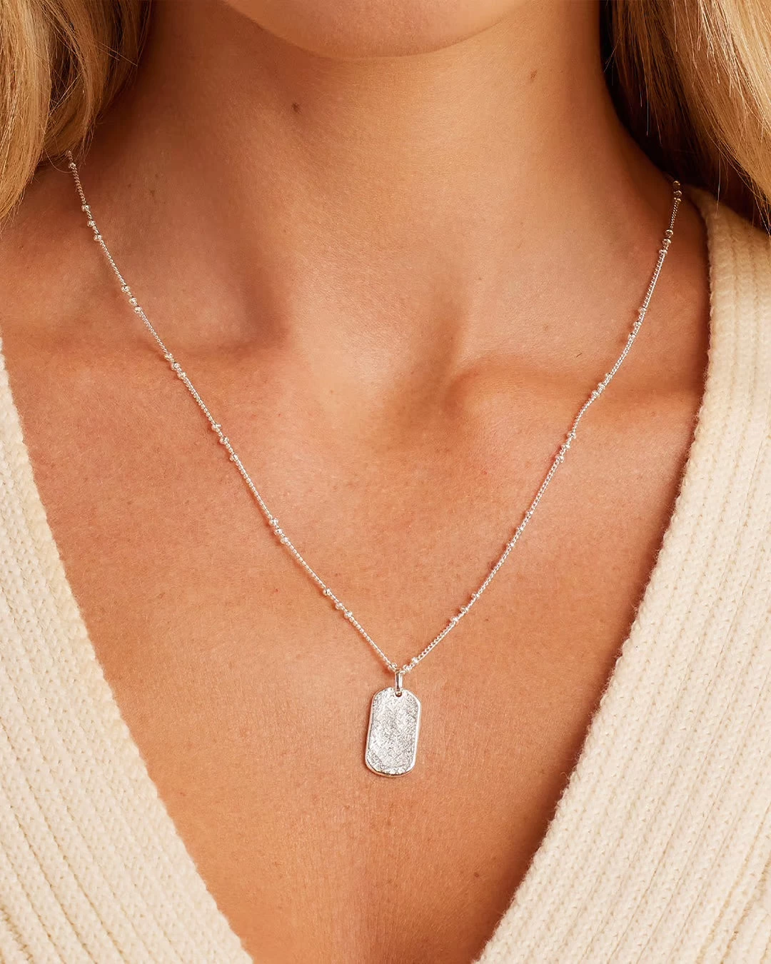 The stylish Griffin Dog Tag Necklace in Silver offers a feminine take on the classic dog tag silhouette. Its lightweight design ensures comfort and ease, making it perfect for everyday wear. Ideal as the longer base chain for a fully layered look, this necklace adds a touch of elegance and versatility to your accessories collection.