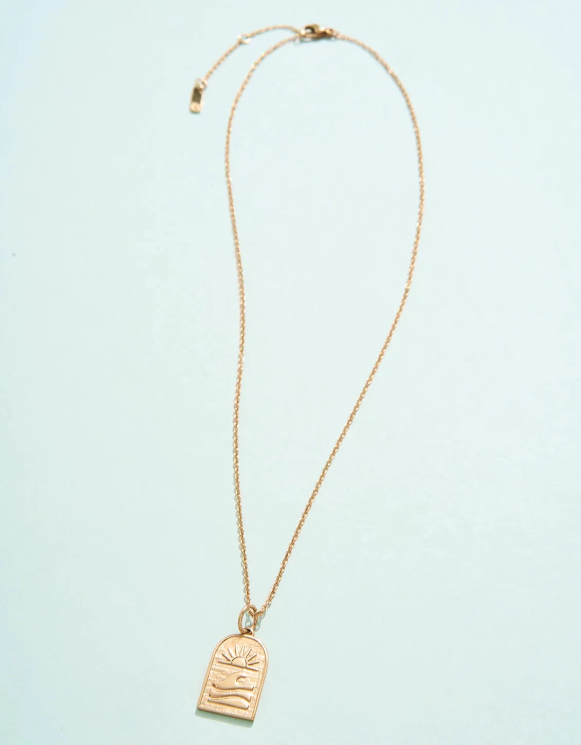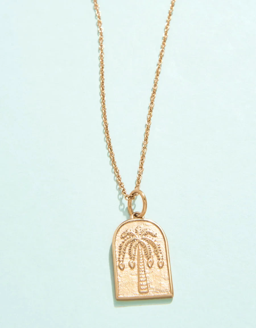 Indulge in the luxurious and timeless beauty of the Isle of Palms Necklace. Crafted with tarnish-free, water-resistant 14kt shiny gold plating over stainless steel, this necklace features a stunning palm tree charm with a reversible sun and sea scene. Designed for everyday wear, exercise, showers, and summer beach days.