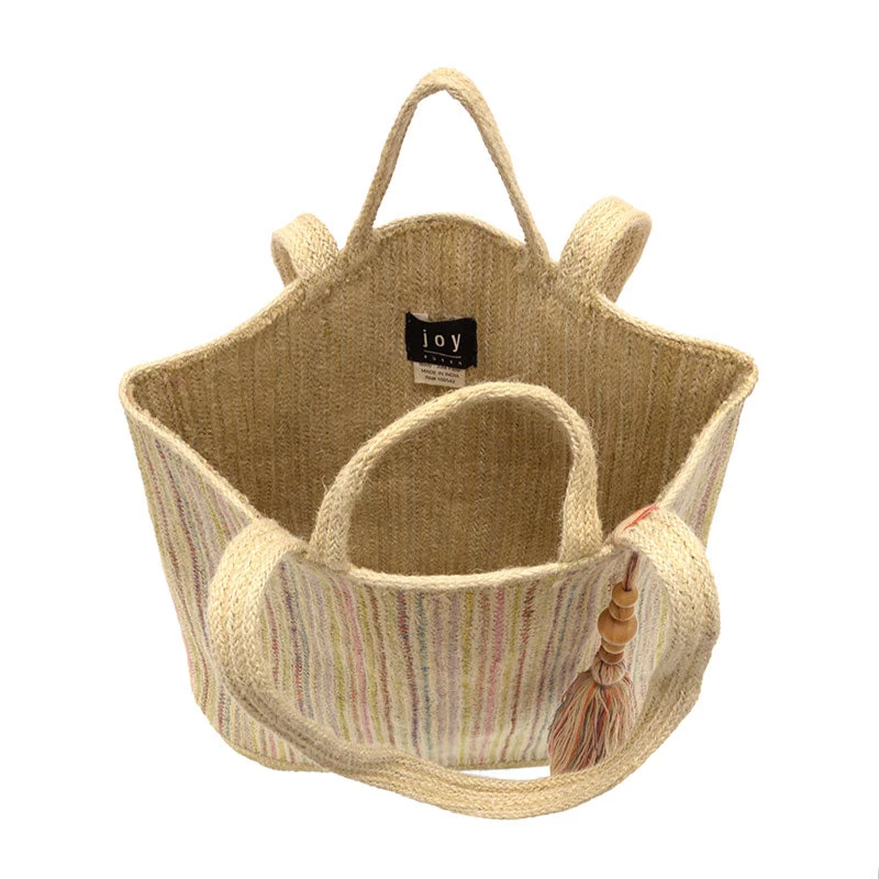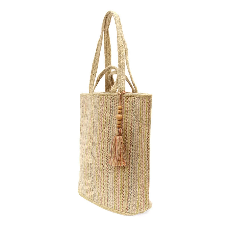 Escape to a luxurious island getaway with our Jute Tote With Bead Tassel. This market tote features tonal stitched stripes in soft, sun-washed colors that evoke relaxation and tranquility. Crafted from natural jute fibers, it’s braided to create a stunning and versatile bag. Perfect for adding a touch of sophistication to your daily errands or beach outings.
