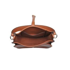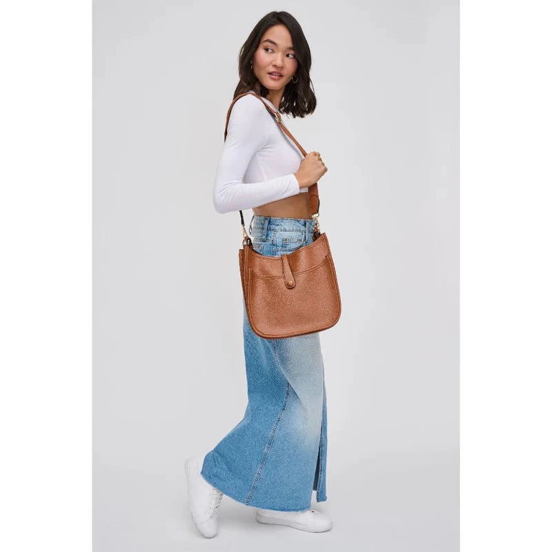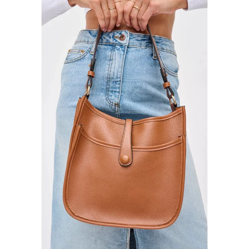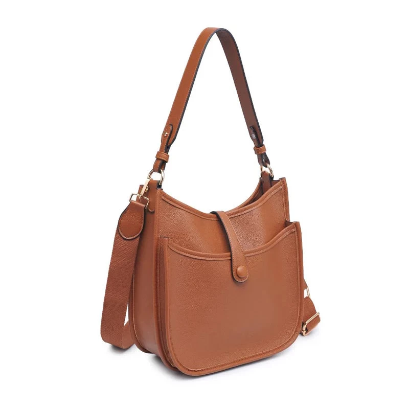 Crafted from pebbled vegan leather and adorned with silver hardware, this bag boasts two compartments for convenient organization. Its secure snap closure adds ease to your everyday style, making it the perfect accessory for those who appreciate both fashion and practicality.