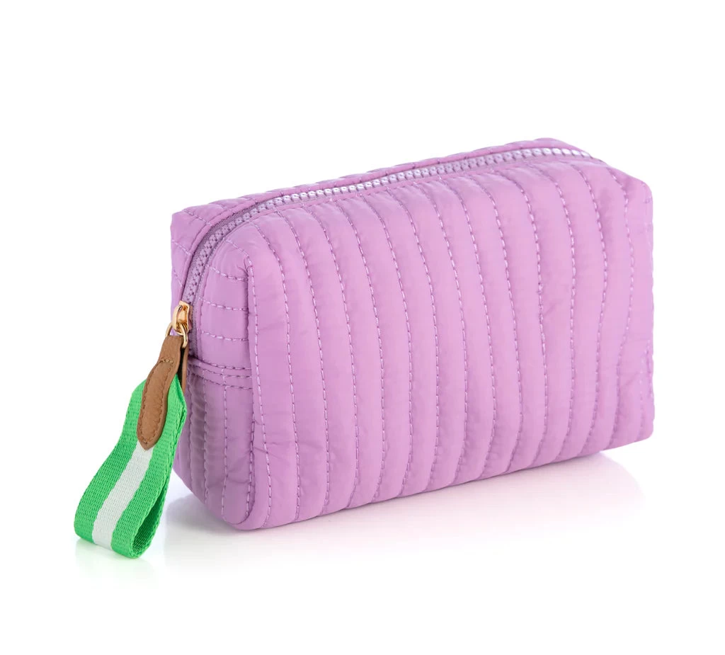The Lilac Ezra Small Pouch is the epitome of luxury and convenience. Made with quilted nylon, this small boxy cosmetic pouch is perfect for storing all your travel essentials, from makeup to toiletries. Keep your belongings organized in style with this elegant and practical pouch.
