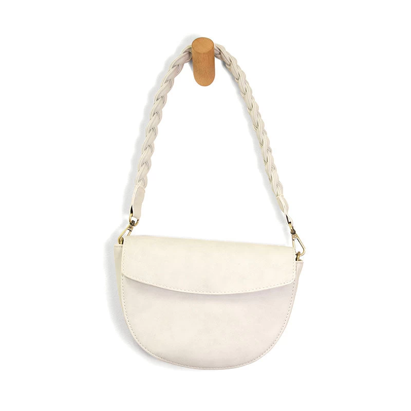 Indulge in sophistication with our Luna Crescent Crossbody in White. The stunning half-moon shape and chunky braided shoulder strap add artisanal flair to any outfit. A magnetic snap and zip closure keeps your belongings secure, while an exterior back pocket and detachable cross-body strap offer convenience and hands-free style.
