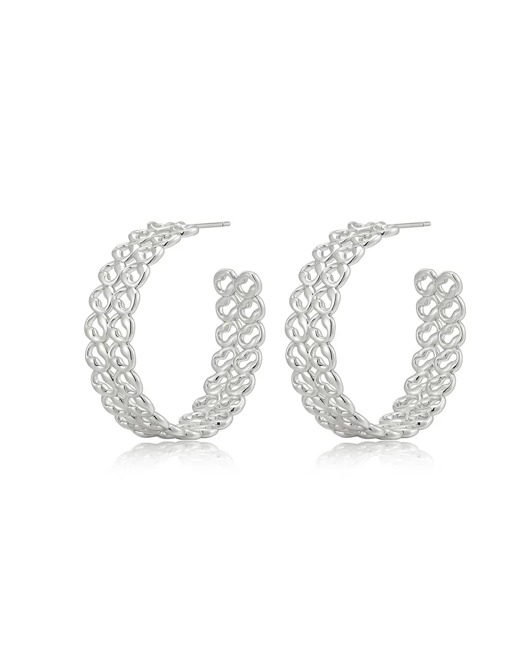 Elevate your style with these Metal Lace Hoops in Silver. The intricate lace pattern adds a touch of elegance to these hoops, making them the perfect statement accessory. Plus, the surgical steel posts make them hypo-allergenic for even the most sensitive ears. Upgrade your jewelry collection with these luxurious hoops.