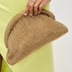 Add a touch of glamour to your evenings with the Mariah Evening Bag in Gold. Featuring sparkling rhinestones and elegant gold hardware, this half-moon-shaped bag is both luxurious and eye-catching. The detachable chain strap and fabric-lined interior provide convenience and style, making it the perfect companion for your nights out.